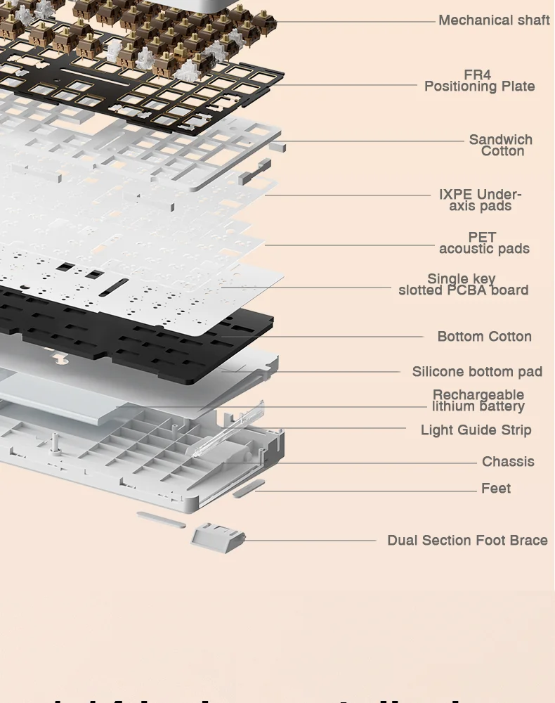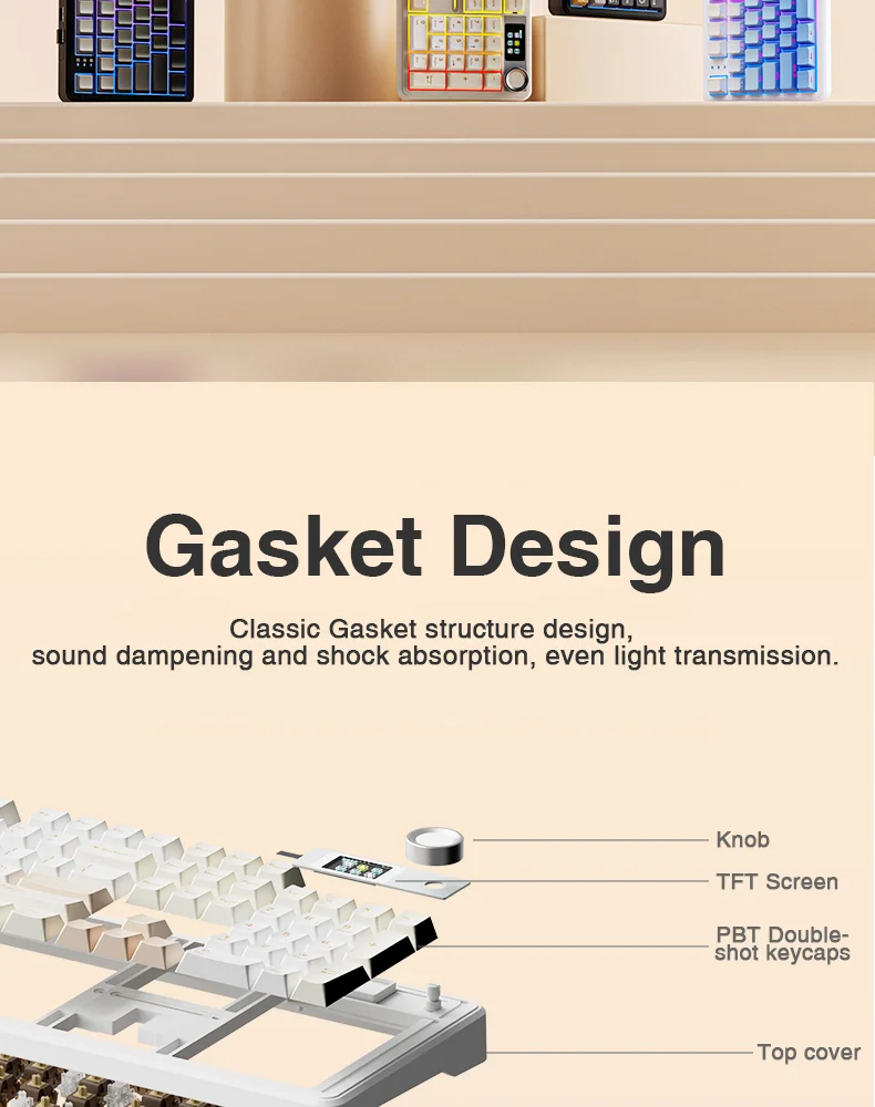 Classic gasket structure with sound dampening and shock absorption for clean acoustics and even light diffusion. Built-in five layers of premium sound-dampening padding deliver a pure typing sound and a more stable feel.
