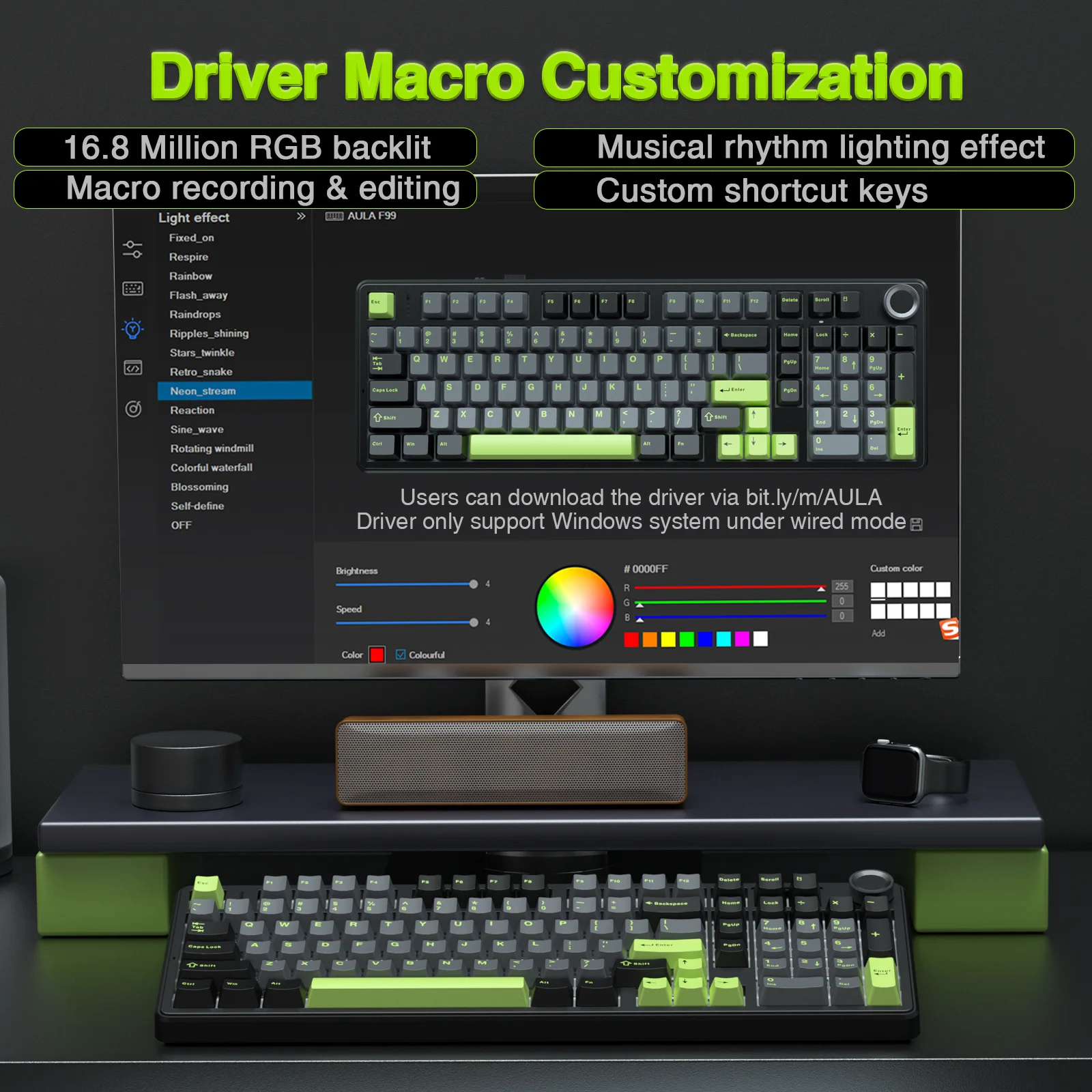 Use the AULA driver to remap keys, adjust RGB effects, create macros, and access more functions. This lets you tailor the F99 PRO to your specific needs and preferences.