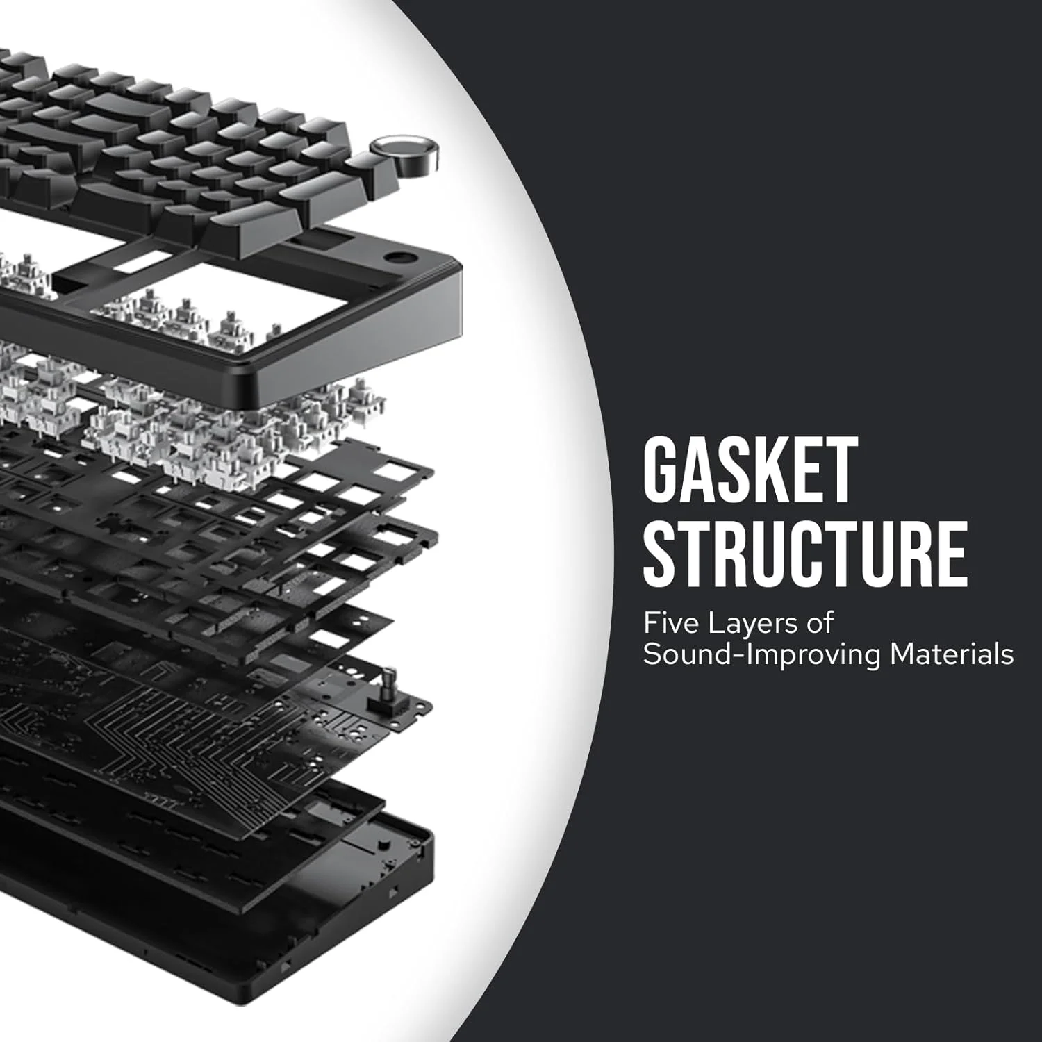 Equipped with five layers of sound-dampening materials, the F99 PRO improves typing acoustics. The combination of sandwich foam, IXPE switch pad, PET sound film, bottom foam, and silicone case pad helps reduce echo and delivers a pure typing sound with a stable and comfortable feel.