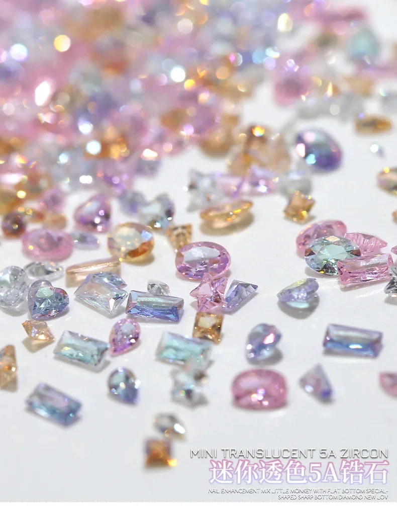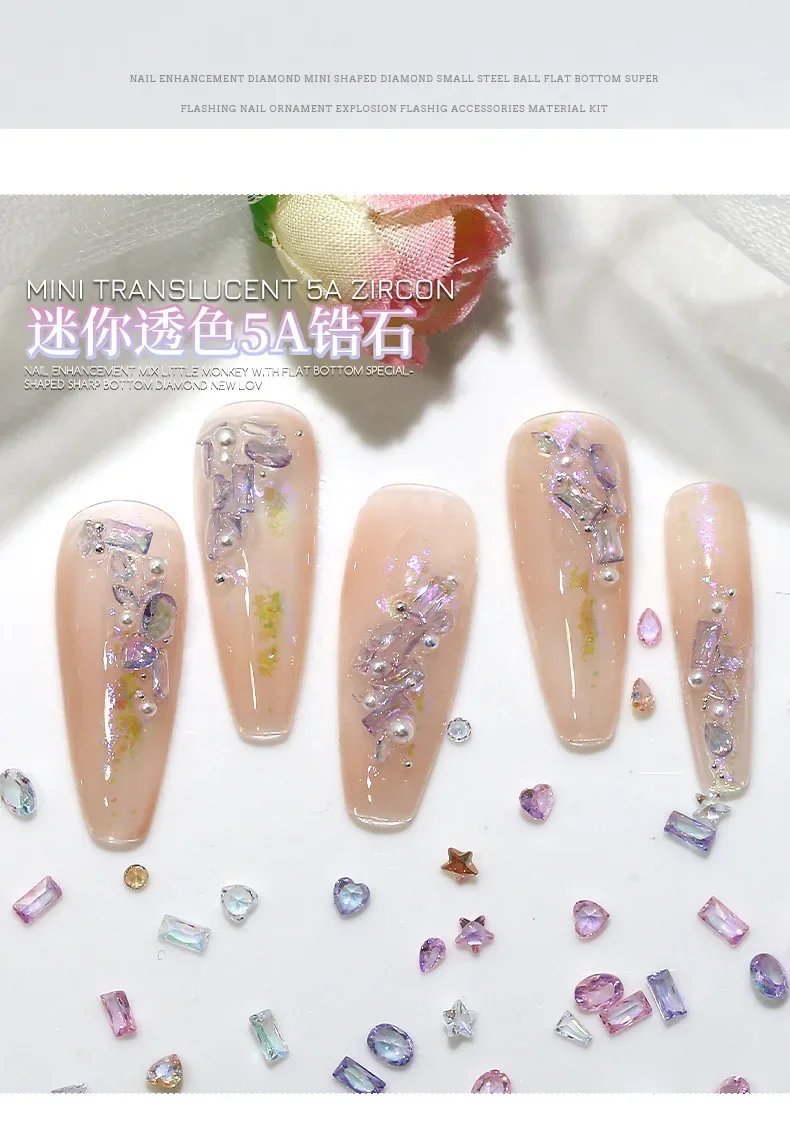 Add a luxurious shimmer to your nails with this set of 50 mini translucent 5A zircon crystals. Featuring an iridescent aurora-ice finish, these high-quality rhinestones come in elegant shapes like hearts, stars, ovals, baguettes, teardrops, and rounds-perfect for creating dreamy, crystal-clear nail designs.