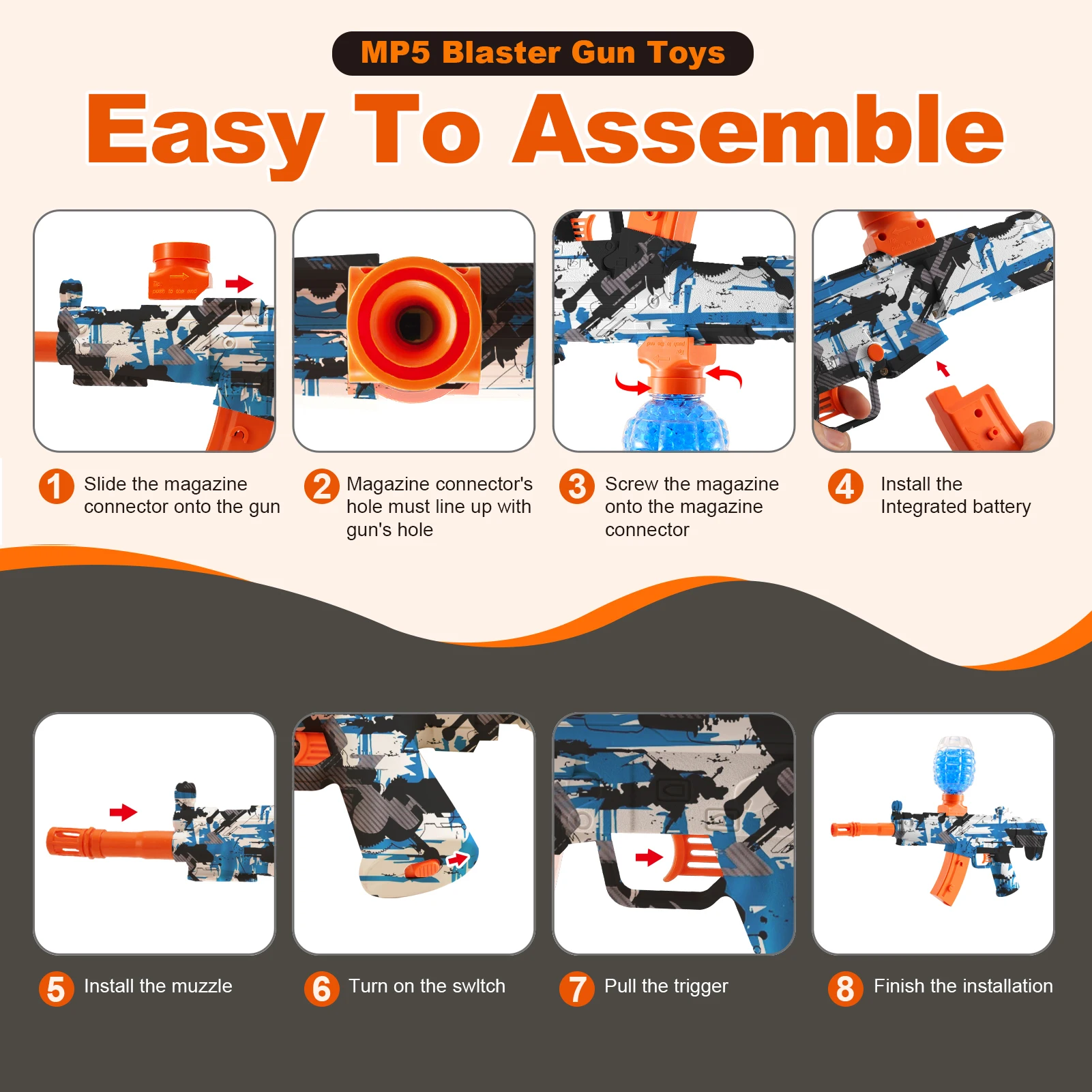 - Durable & Dynamic Design: Sporting an awesome MP5-style camouflage pattern in blue, white, and black with vibrant orange accents, this blaster looks as fierce as it performs. Its robust construction ensures durability for countless hours of thrilling play.