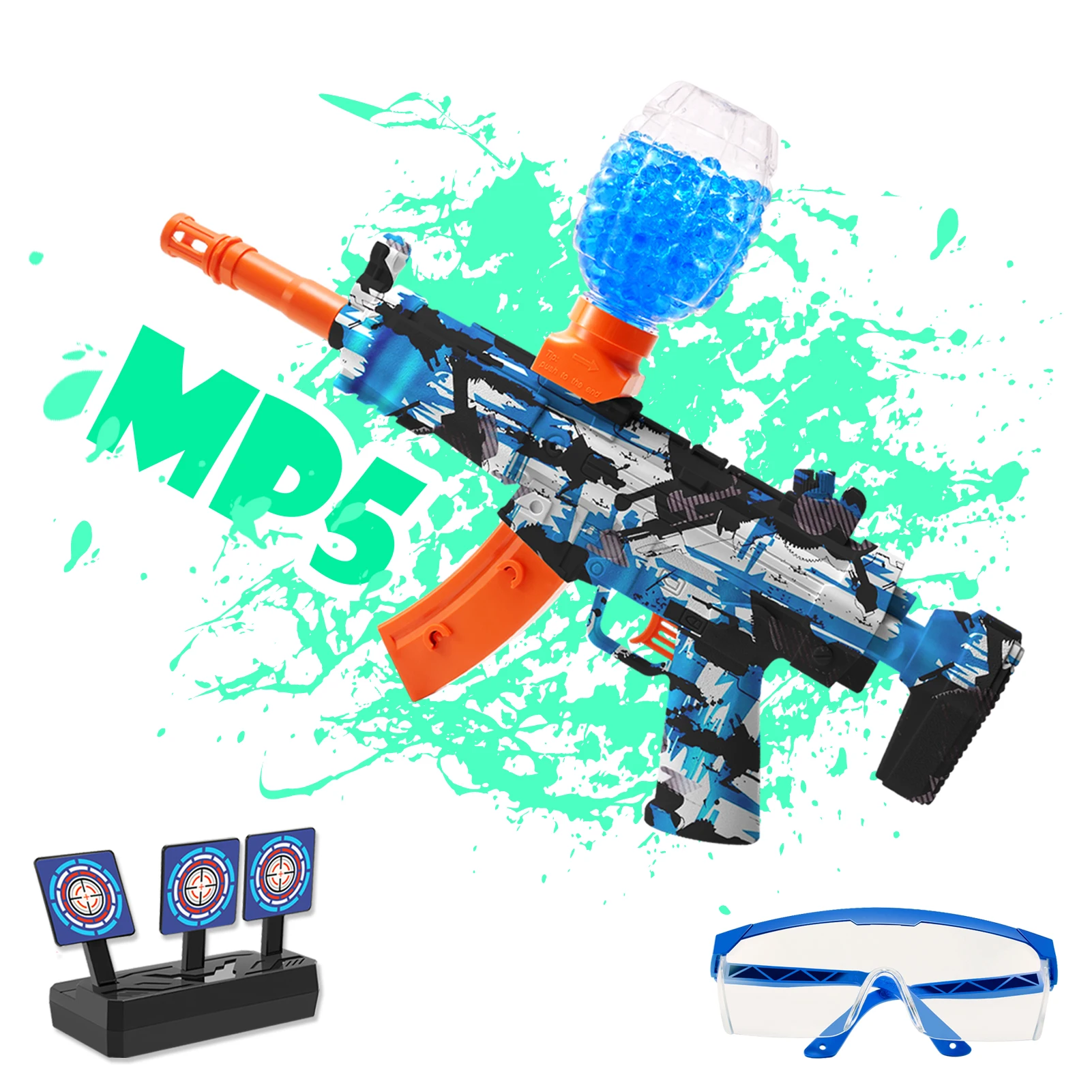 - Complete Ready-to-Play Kit: Everything you need for immediate fun is included! Each kit comes with the MP5 Gel Blaster, a convenient USB charger for the integrated battery, essential safety goggles to protect your eyes, and a set of homing targets to sharpen your aiming skills.