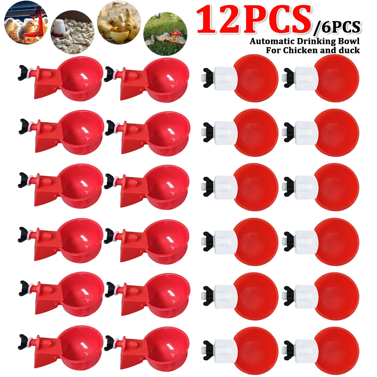 - Red and White 12pcs: 2 x 6 PCS x Chicken and Duck Automatic Watering Bowl