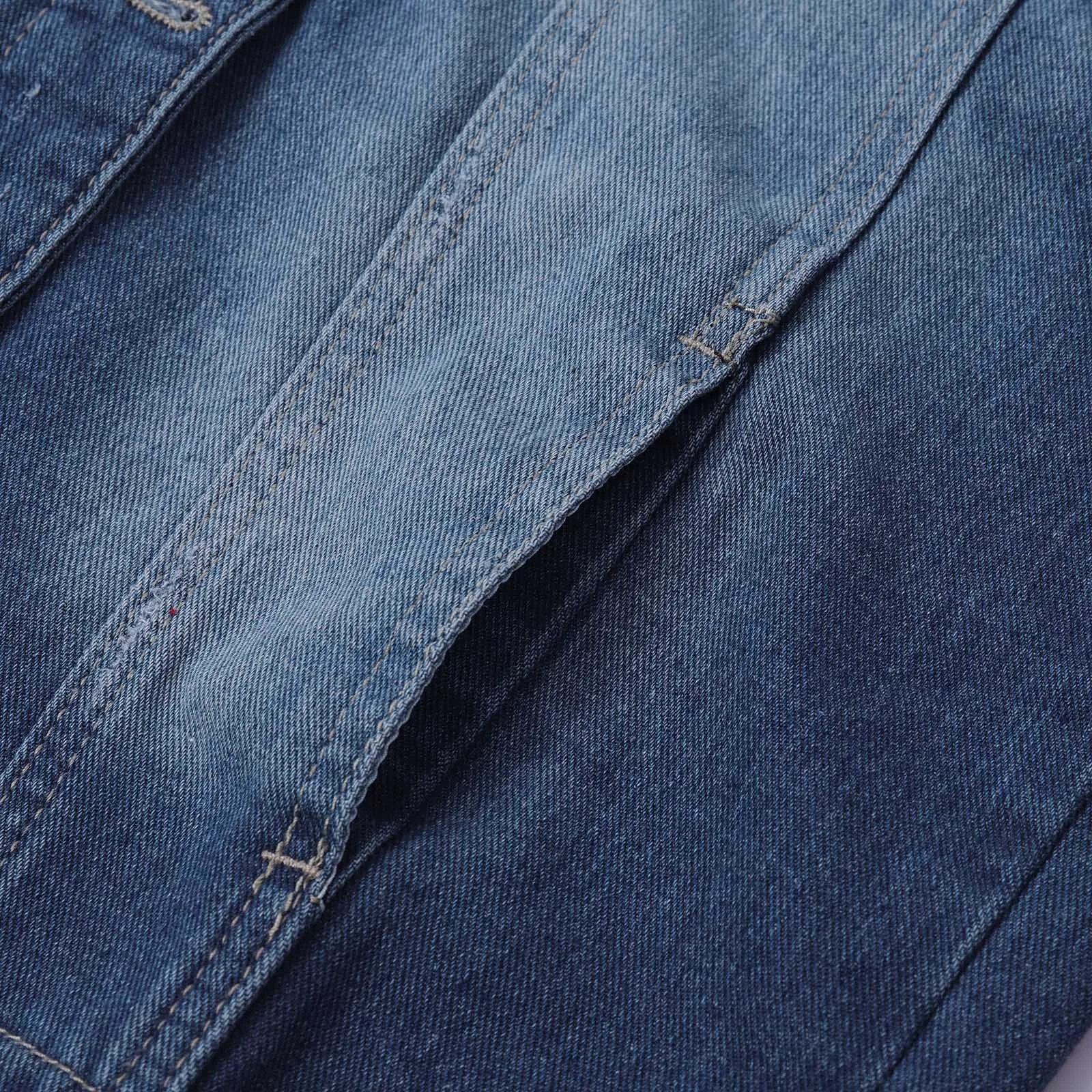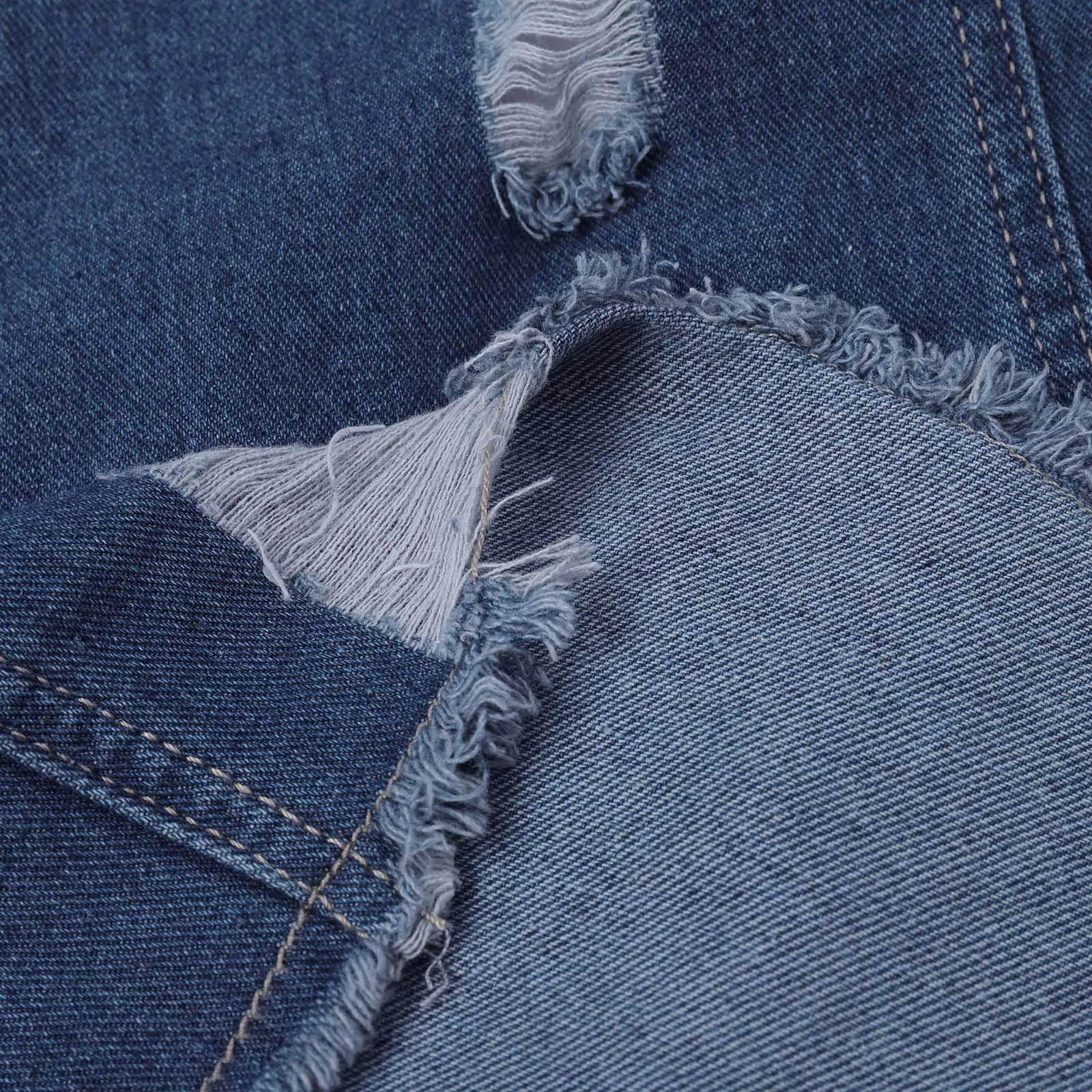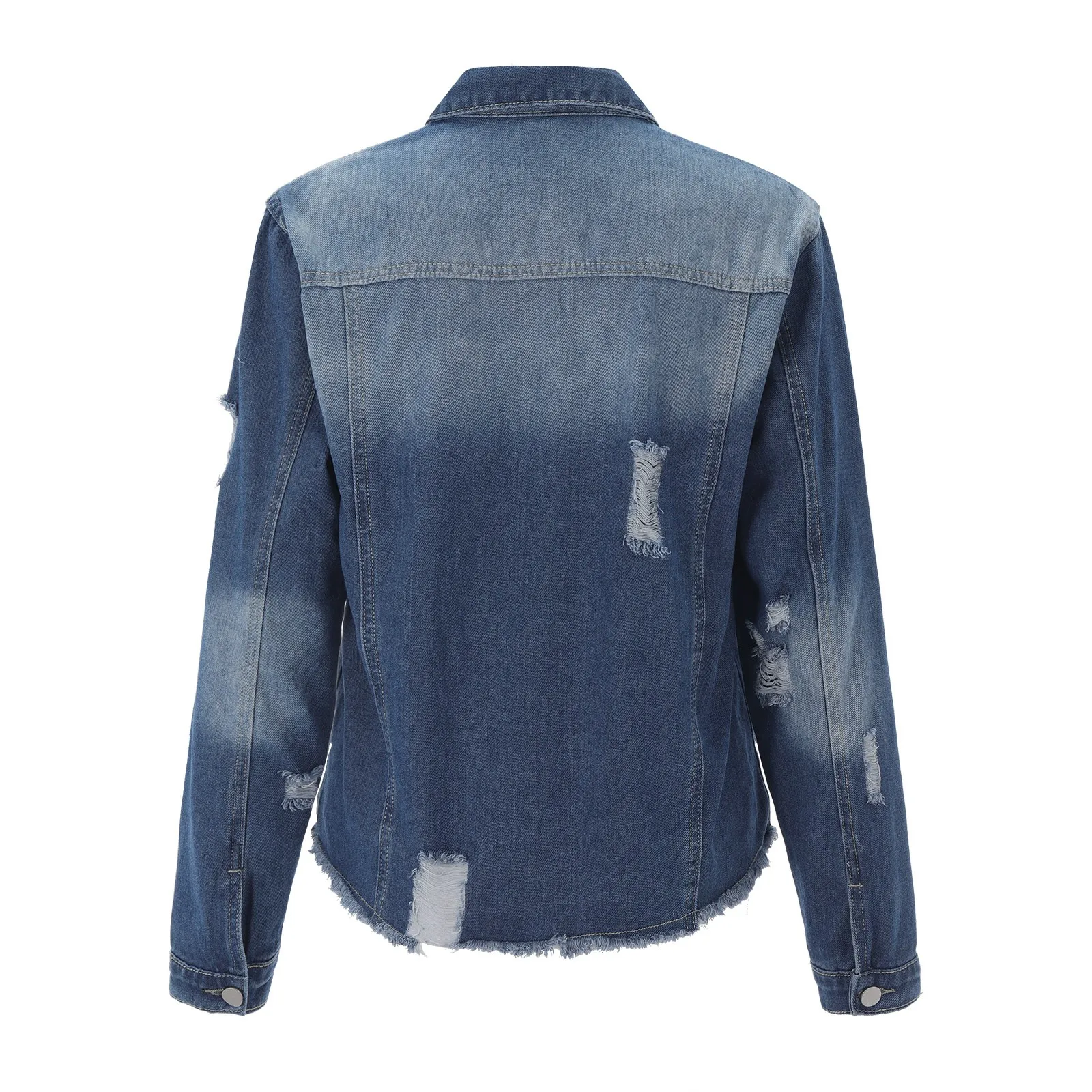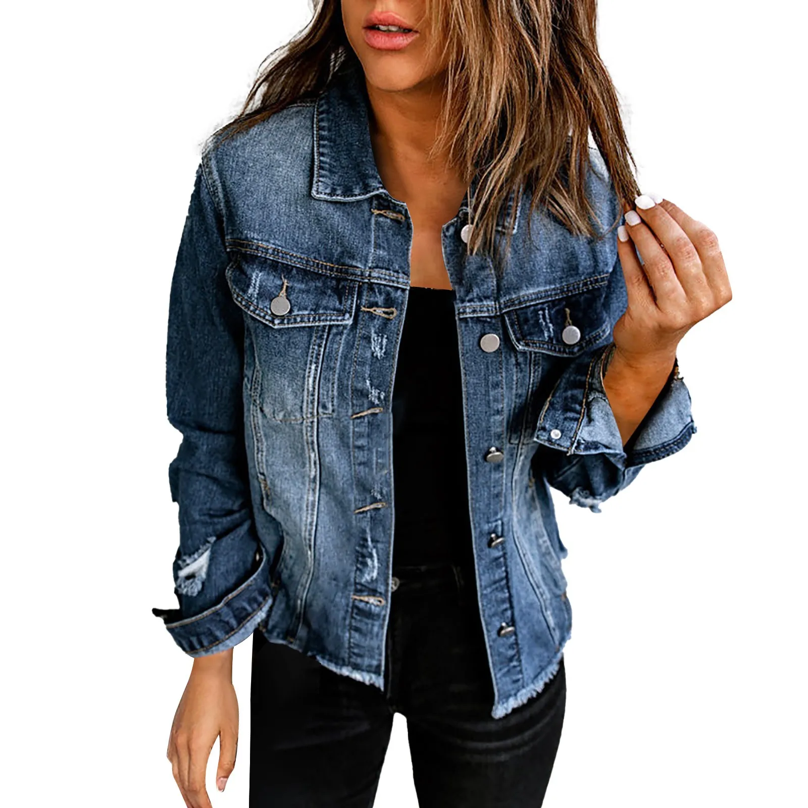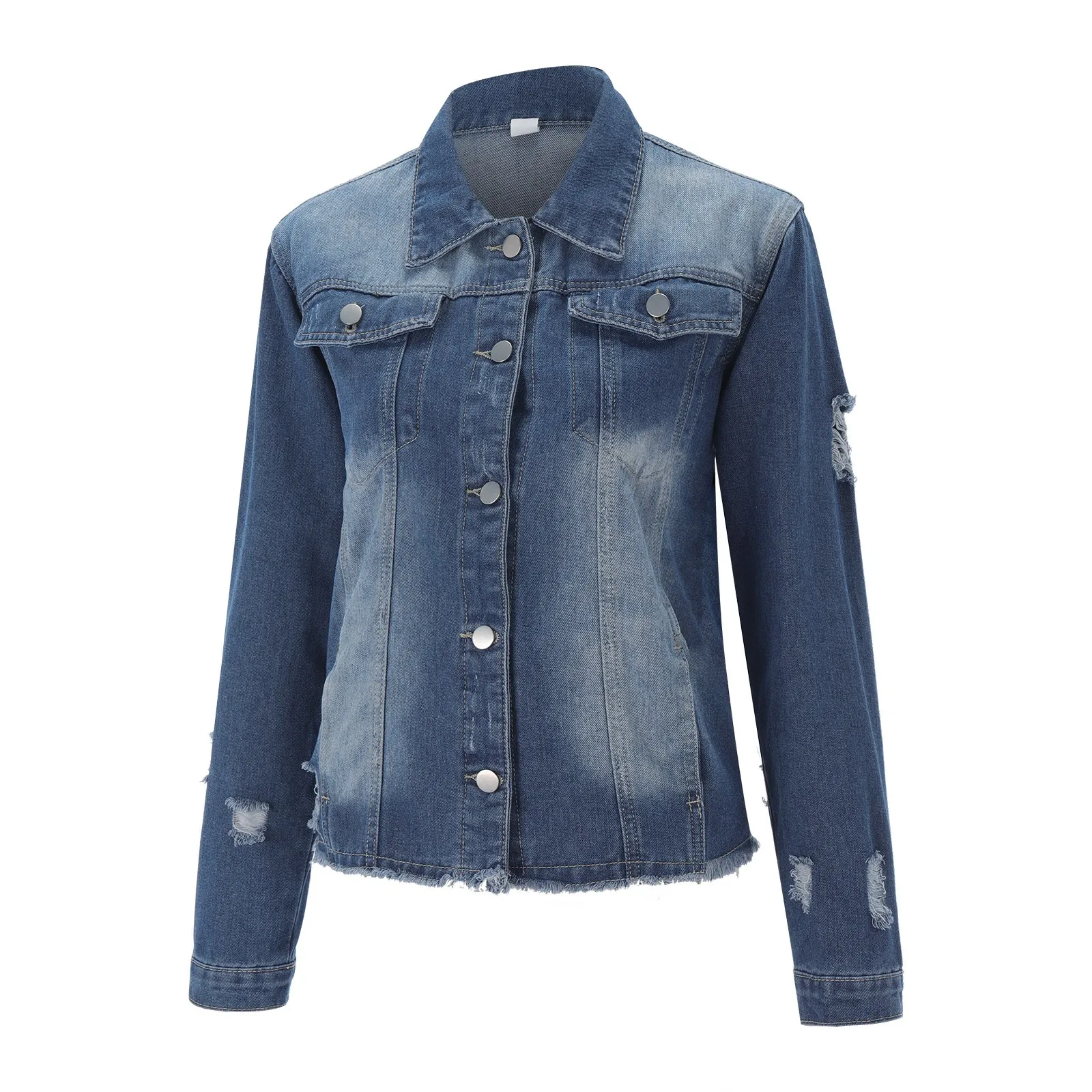 - A stylish four-pocket ripped fringed lapel denim jacket.