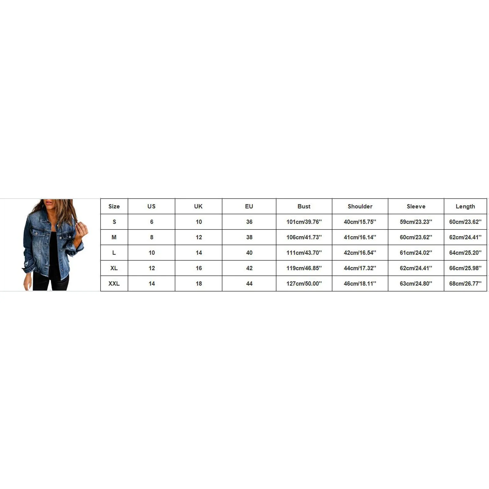 - XXL: US 14, UK 18, EU 44; Bust: 127 cm/50.00”, Shoulder: 46 cm/18.11”, Sleeve: 63 cm/24.80”, Length: 68 cm/26.77”