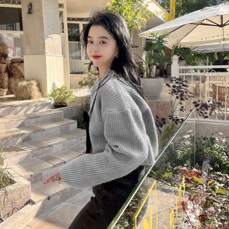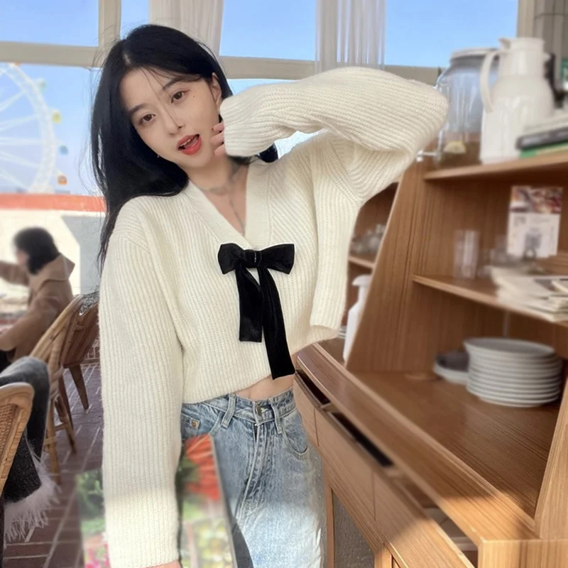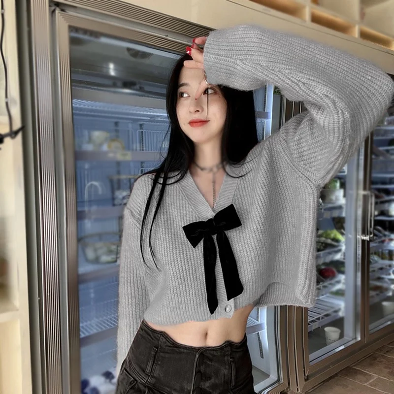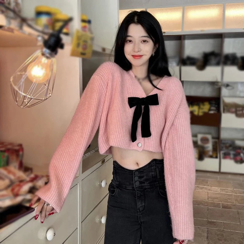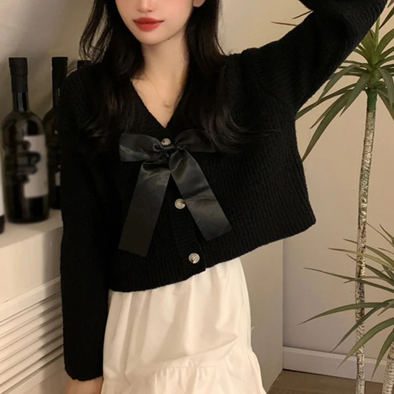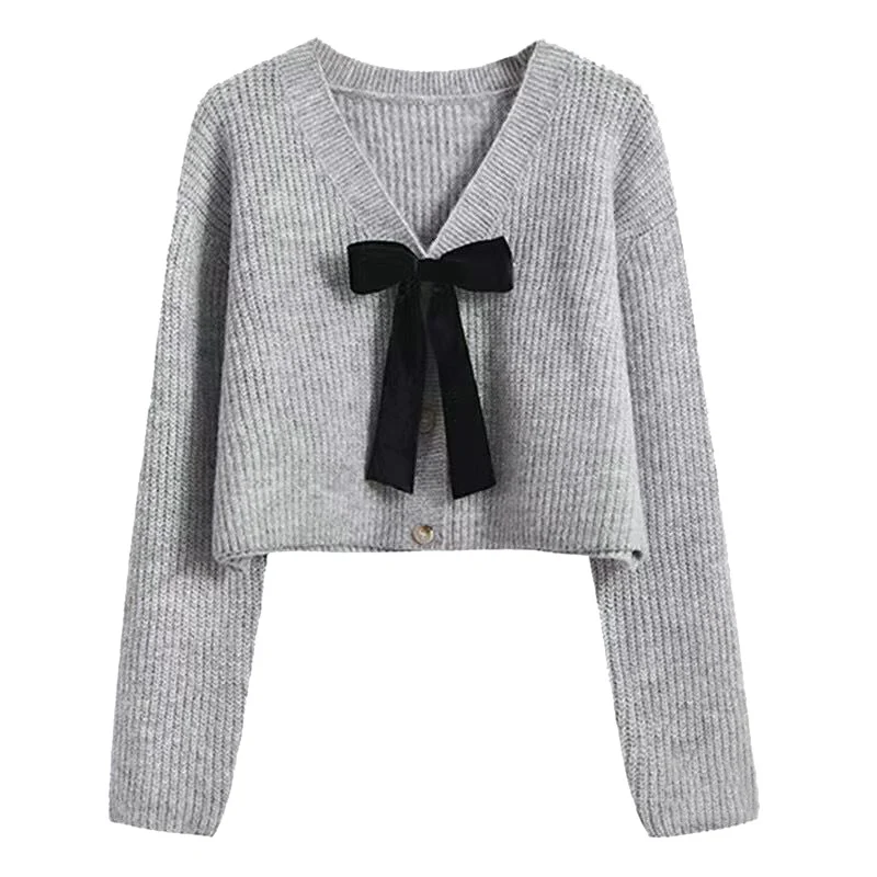 - Features: Lady sweater, sweet design, V-neck, bow, cropped style, coat, knit, long sleeve cardigan