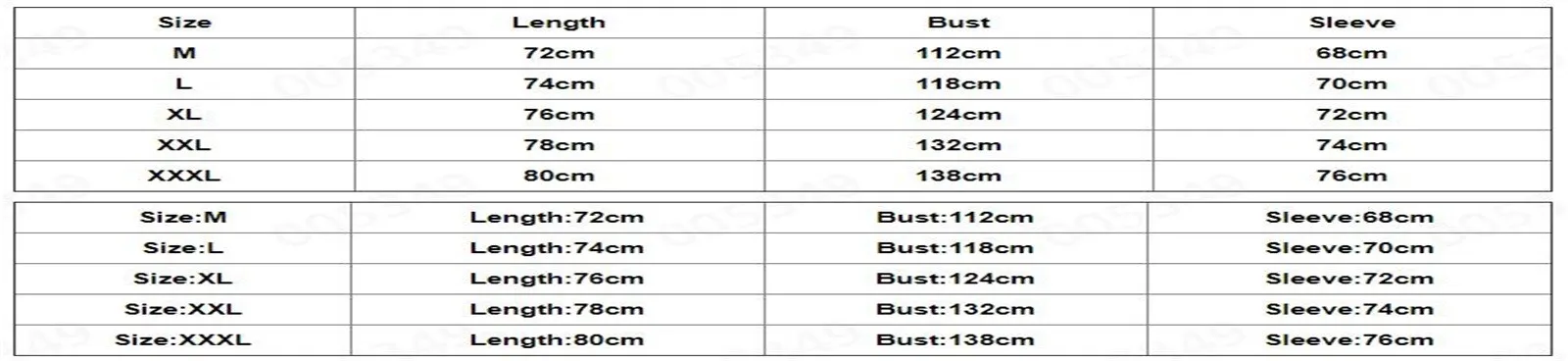 - XXXL: Length 80cm | Bust 138cm | Sleeve 76cm
