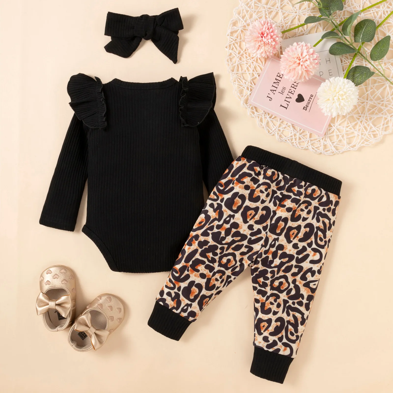 Baby Girls Fall Leopard Print Romper Set with Accessories