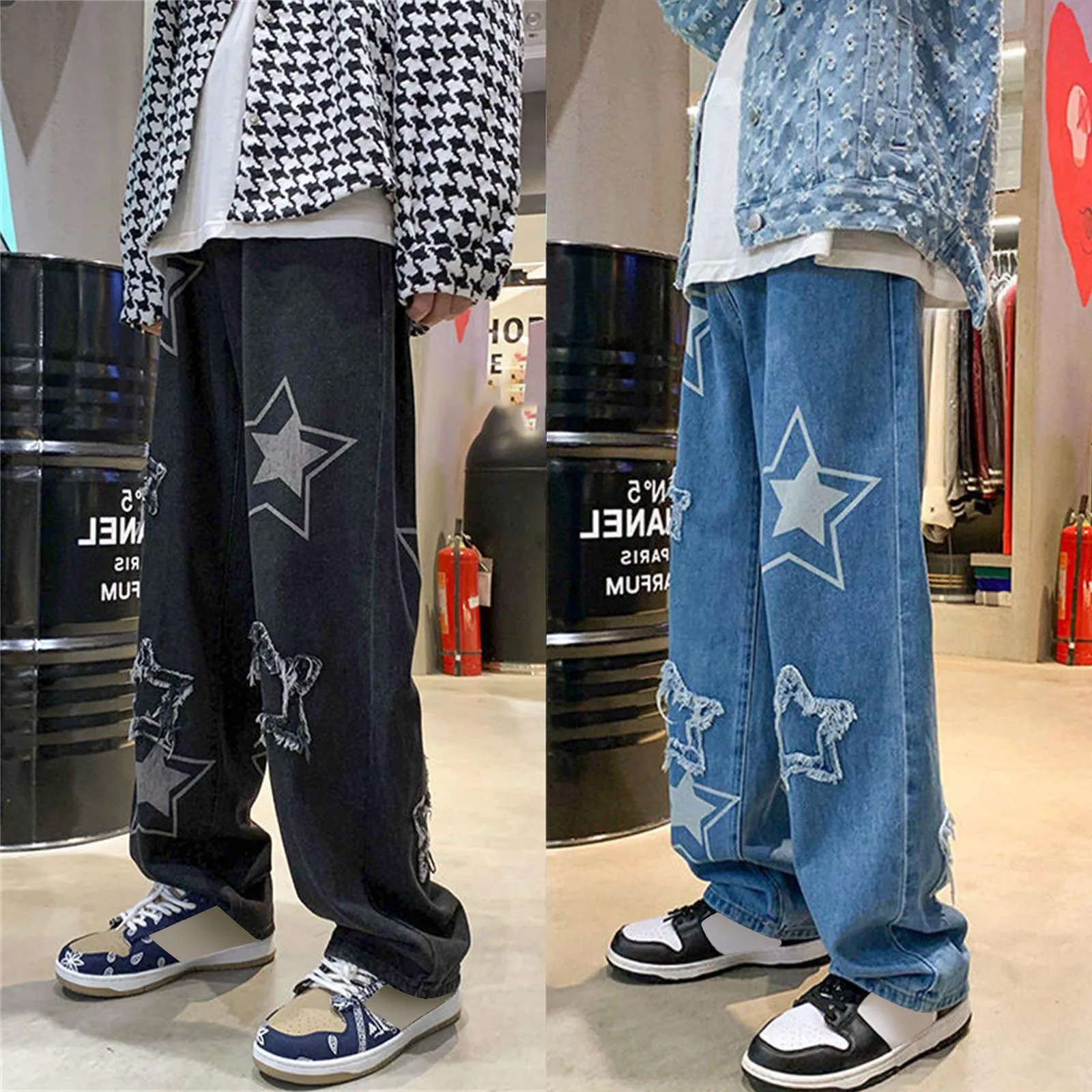 Design: Hip hop jeans pants, straight wide-leg trousers, loose fit, classic pockets, button zip closure, crisscross, embroidered. Fashion style is suitable for you.