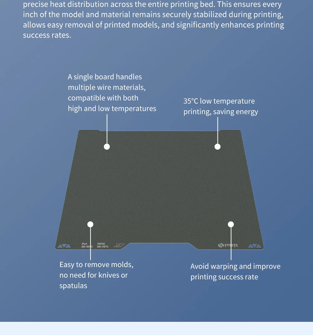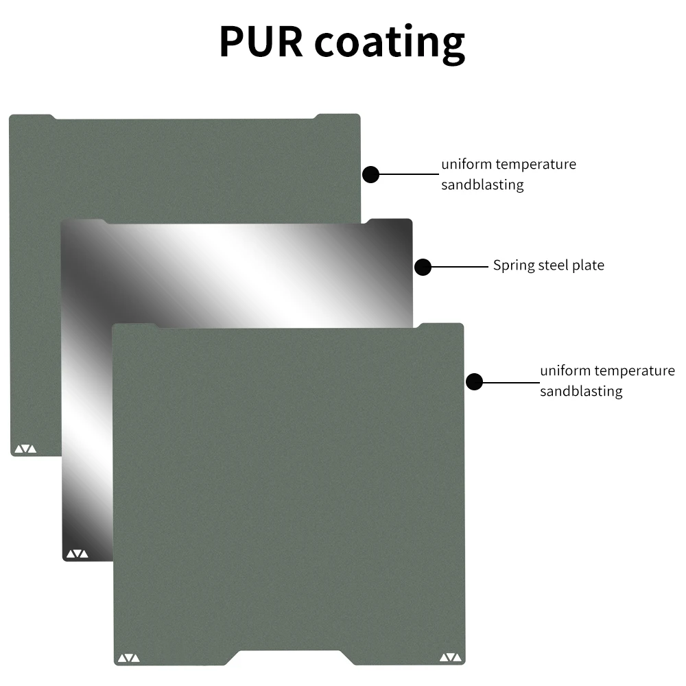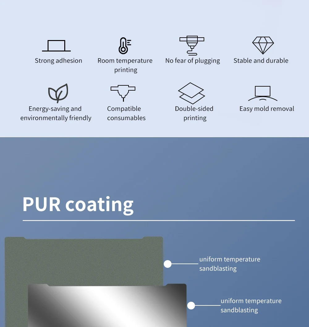 - Ultra-Adhesion for Low-Temperature Printing: Achieve perfect first layers without needing glue or spray! Our unique PUR coating, combined with a uniform temperature sandblasting surface, provides “Strong adhesion” even at low temperatures. Print PLA as low as 30-50°C and PETG at 50-70°C, drastically reducing energy consumption and heating time for your print bed.