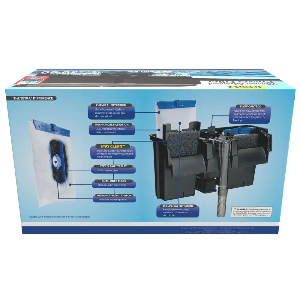 Uses Stay Clean technology to help keep your aquarium clean, clear, and healthy, reduce buildup on aquarium glass, and bind small dirt particles to make them easier to filter. This filter uses easy-to-change Tetra Whisper Bio-Bag Cartridges and includes 2 size large filter cartridges (replacements sold separately). Filter cartridges trap particles floating in your aquarium. The Tetra Whisper Power Filter 30-60 treats aquariums up to 60 gallons (330 GPH).