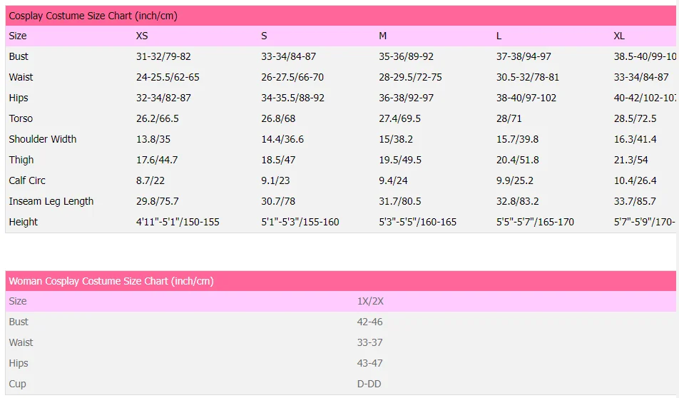Cosplay Costume Size Chart (inch/cm)