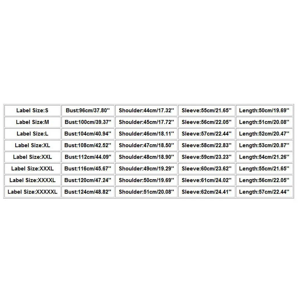 - 5X Large (XXXXXL): Bust – 124 cm (48.82 inches), Shoulder – 51 cm (20.08 inches), Sleeve – 62 cm (24.41 inches), Length – 57 cm (22.44 inches)