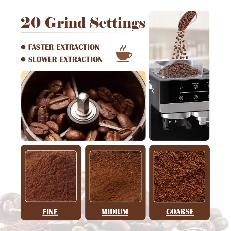 - Built-In Grinder: An integrated grinder with 20 settings (coarse to fine) delivers freshly ground coffee on demand—no separate grinder needed and maximum flavor retention.