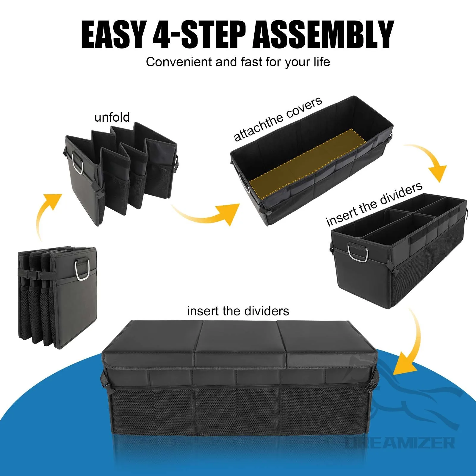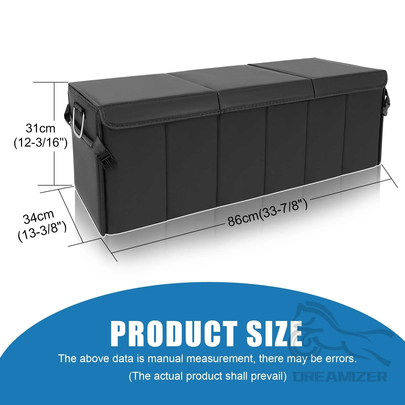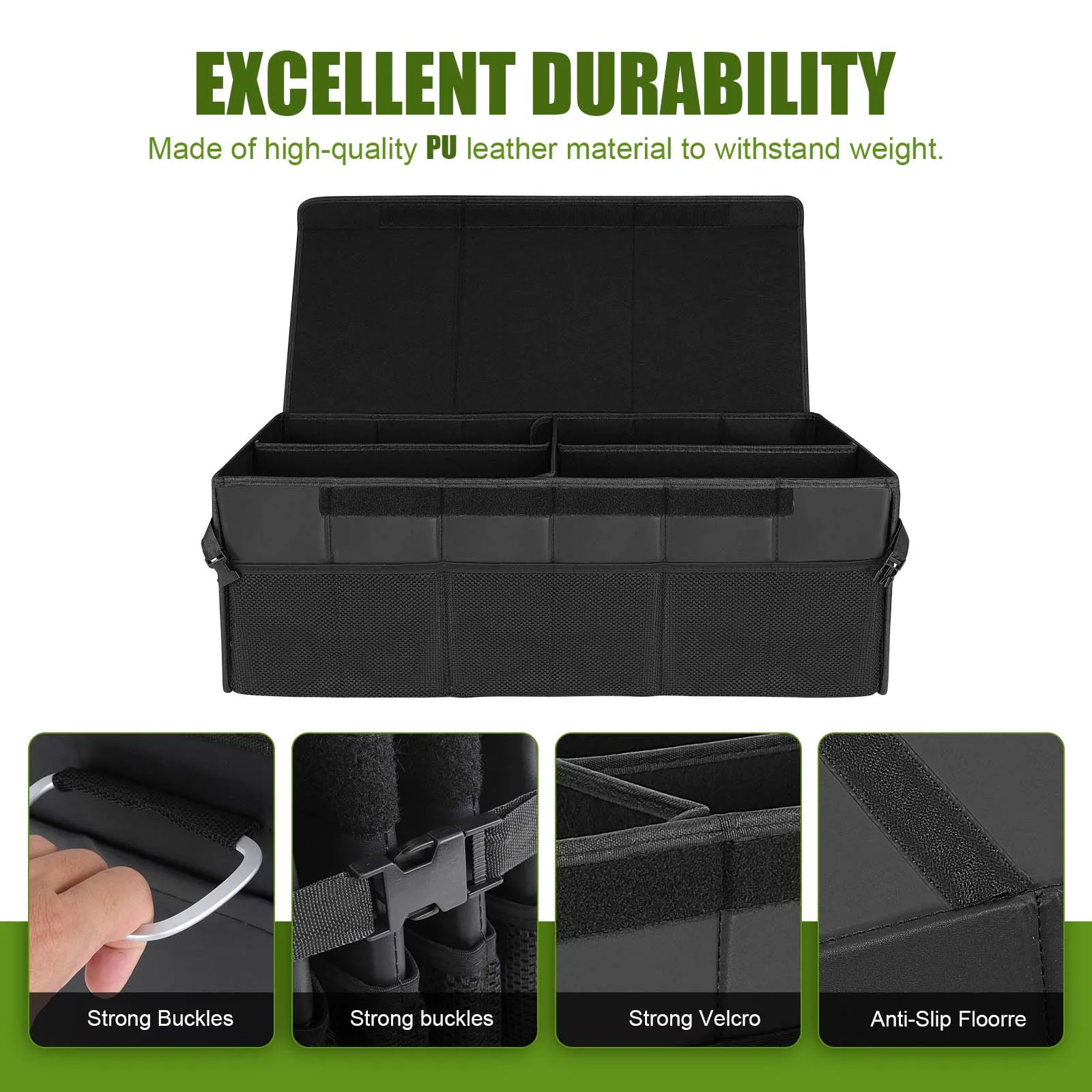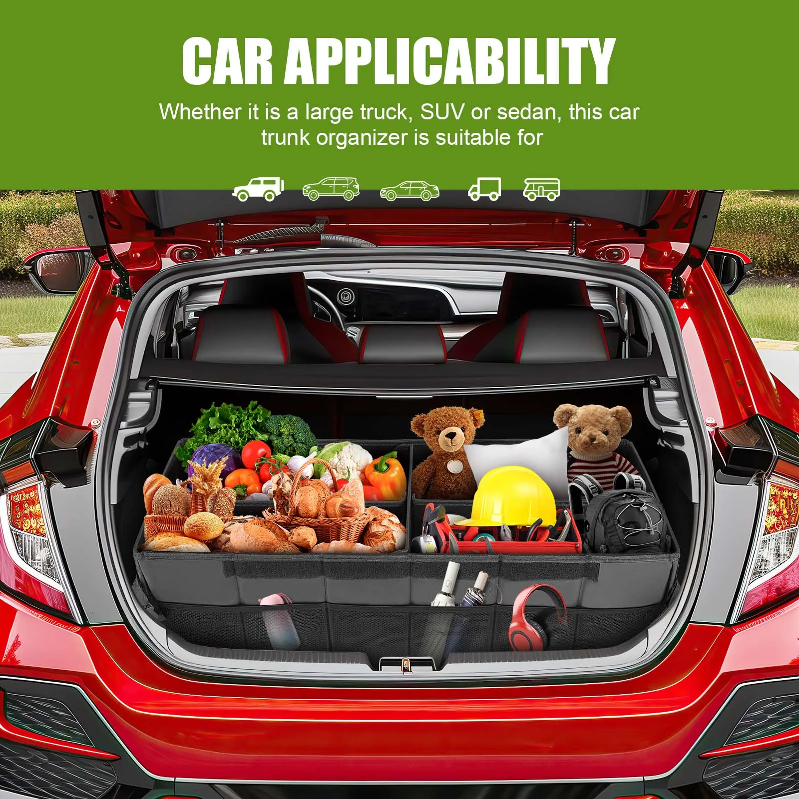- Sturdy Box Design: Premium trunk storage organizer reinforced with rigid base plates supporting all side panels. Reduces mess with multiple side pockets and up to 3 compartments.
