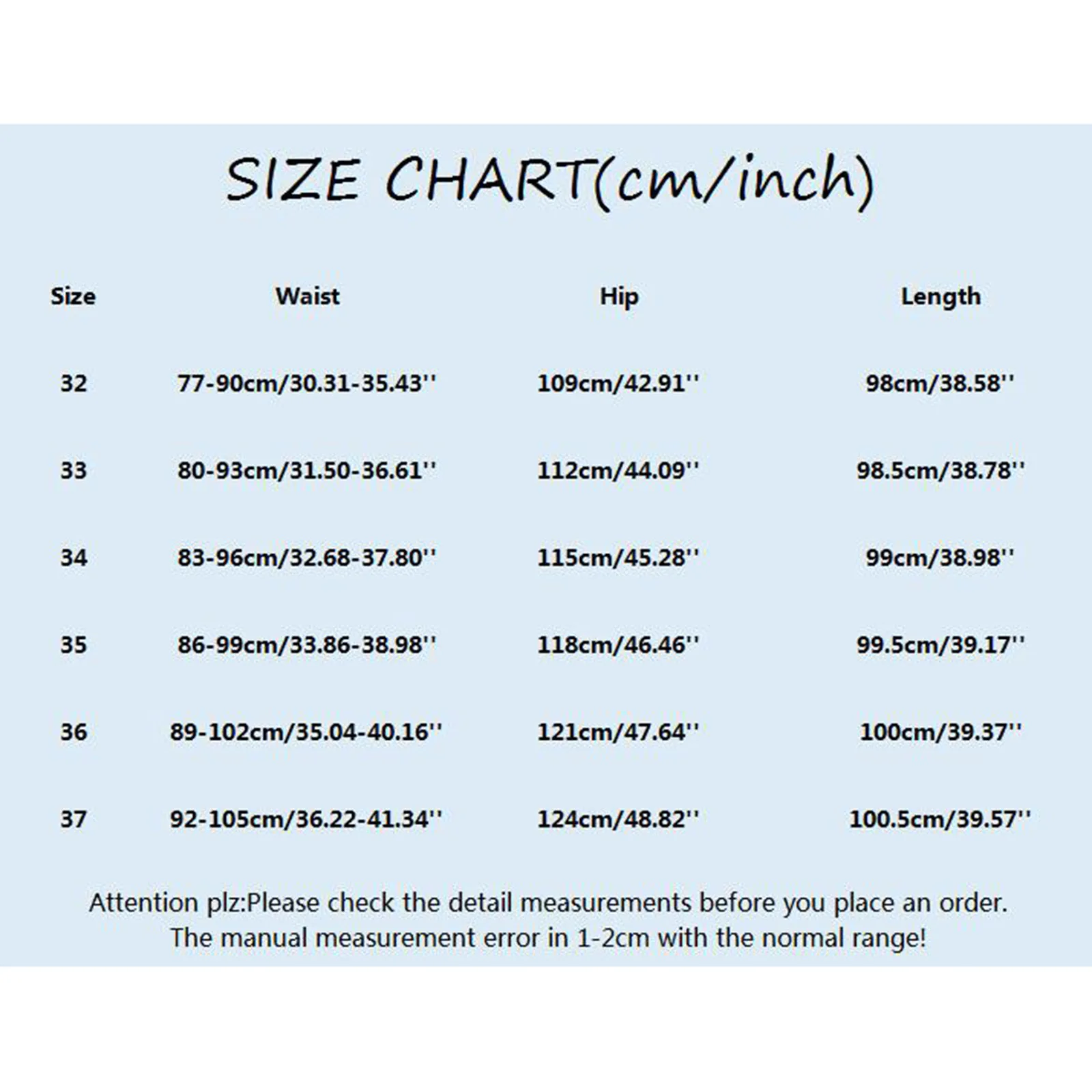 Size: 32, Waist: 77-90cm/30.31-35.43”, Length: 98cm/38.58”
