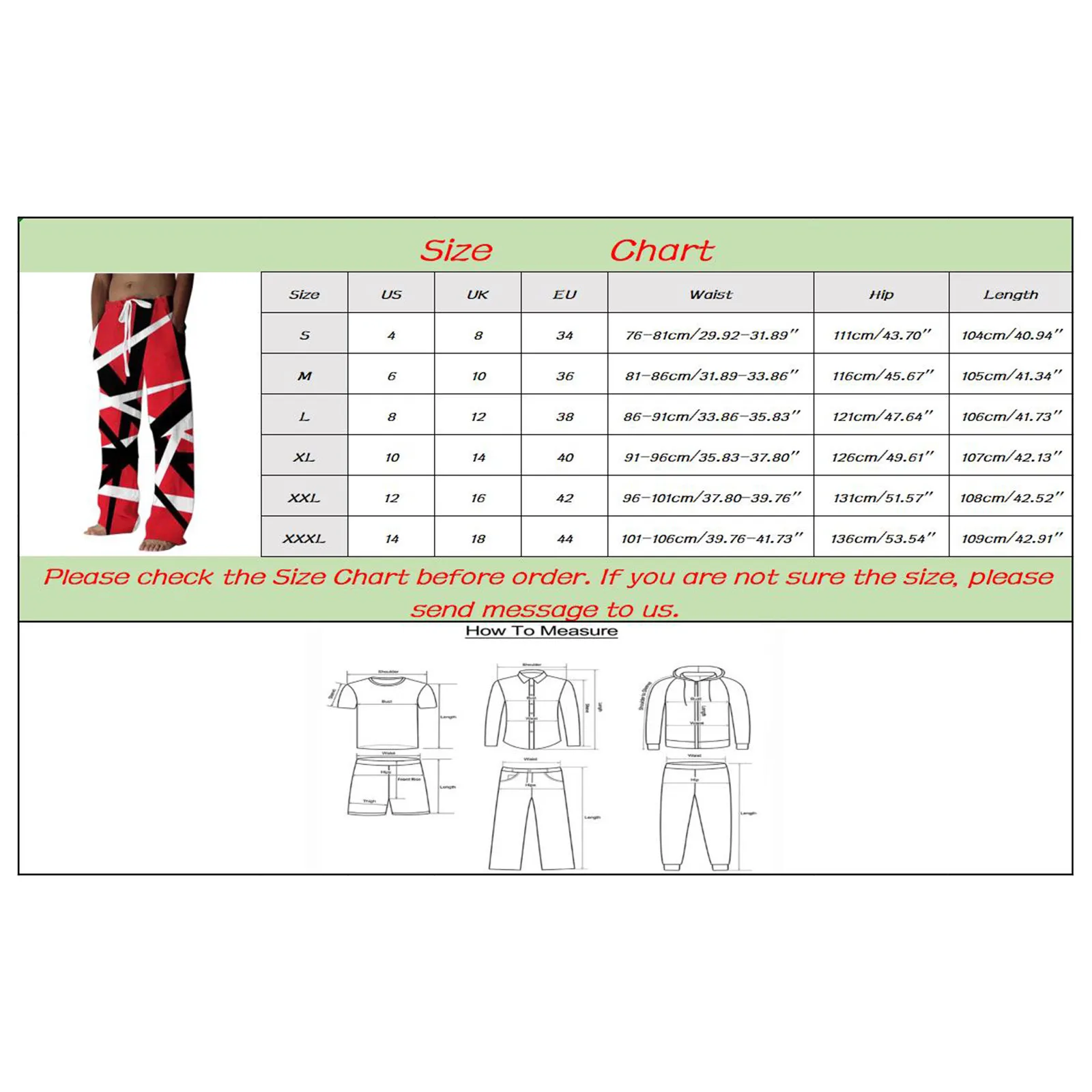 Size: XXXL, Waist: 101-106cm/39.76-41.73”, Hip: 126cm/49.61”, Length: 112.5cm/44.29”