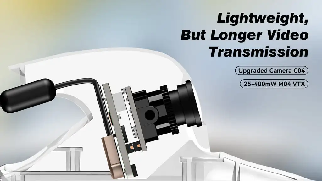- Comes with M04 25-400mW VTX and C04 FPV camera