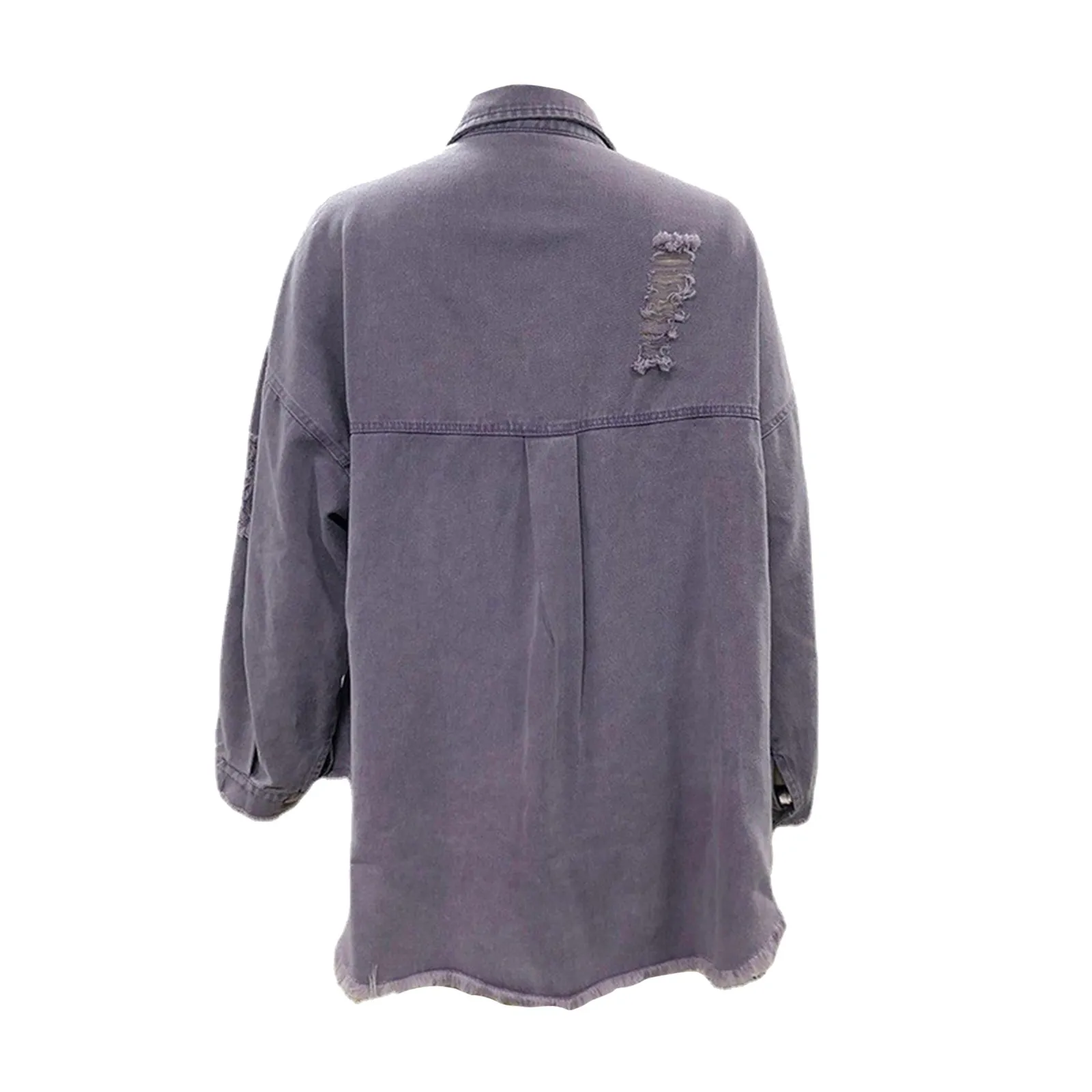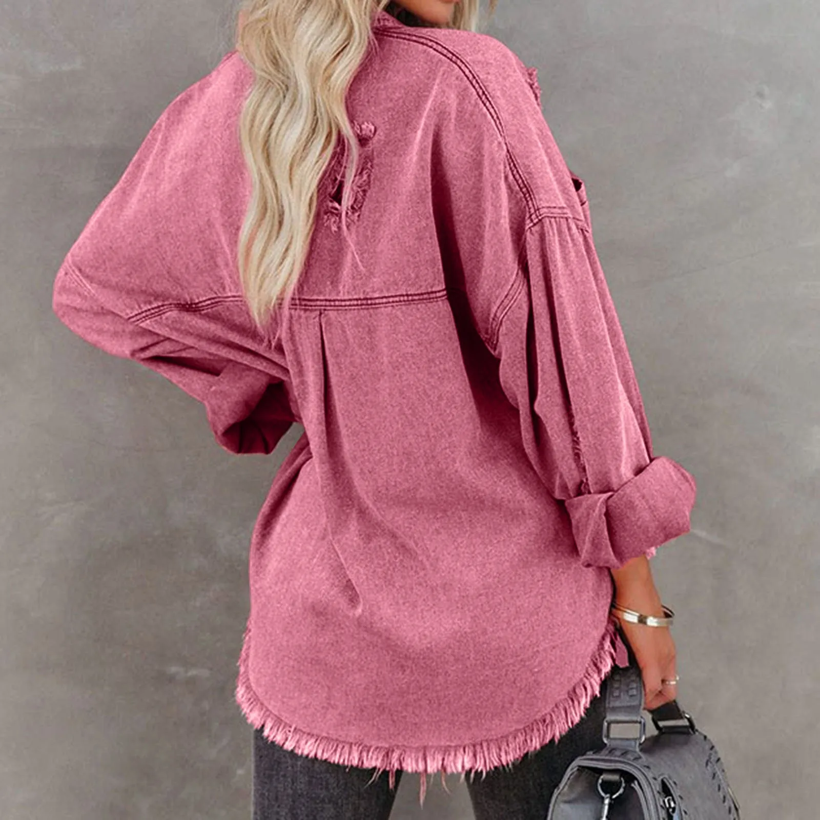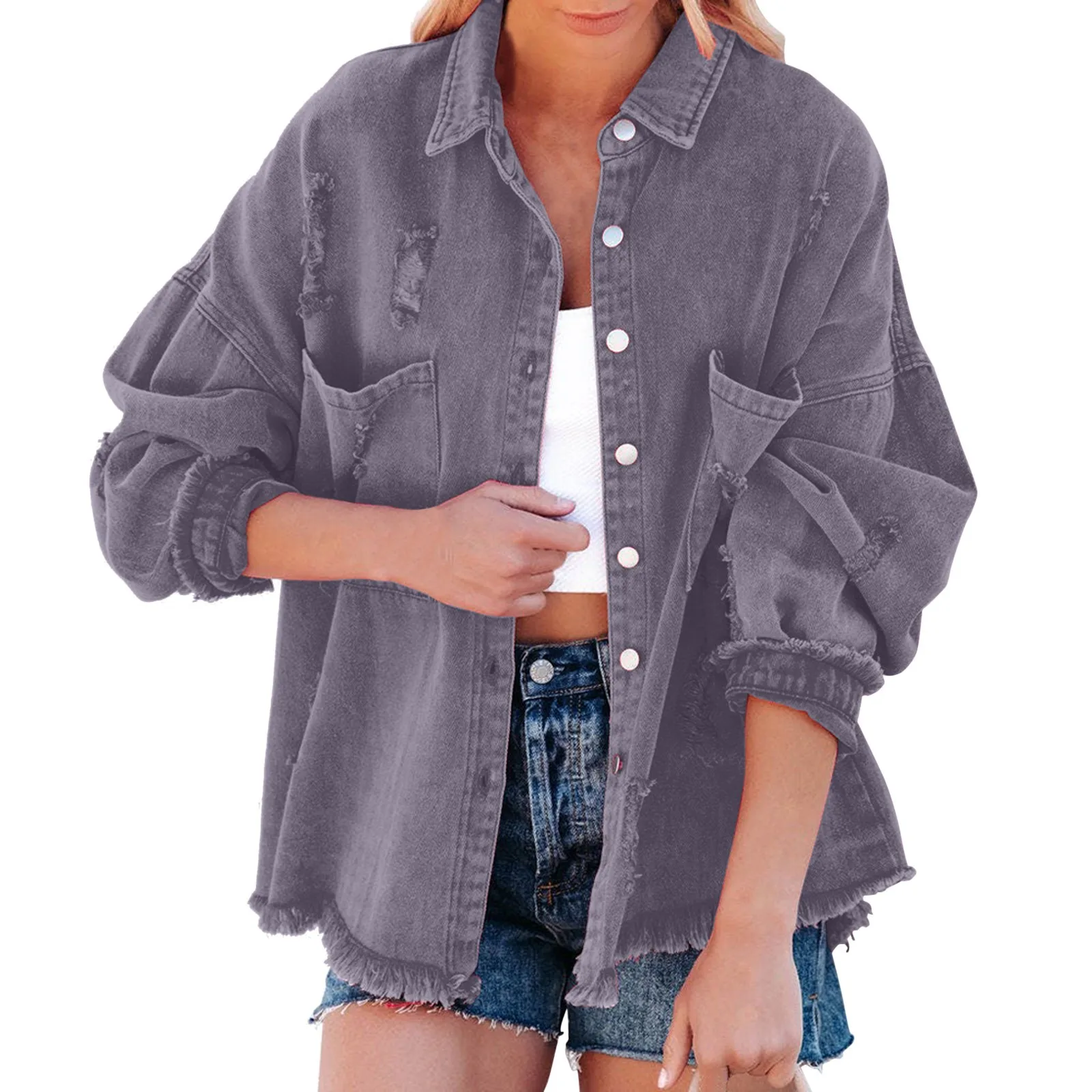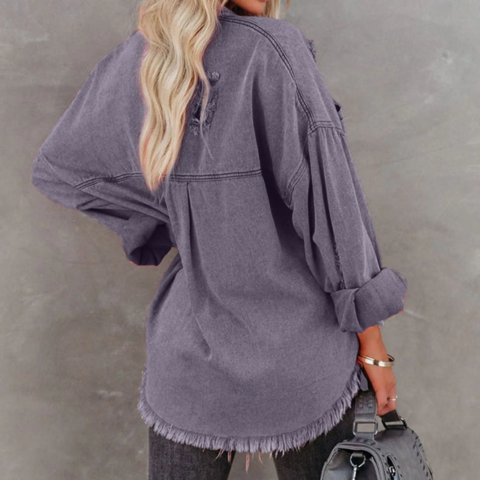 - Design & Style: This casual jean jacket features a lapel collar, long sleeves, two chest flap pockets, and a front button closure. The button cuffs and frayed hem add to its unique texture, making it a standout piece.