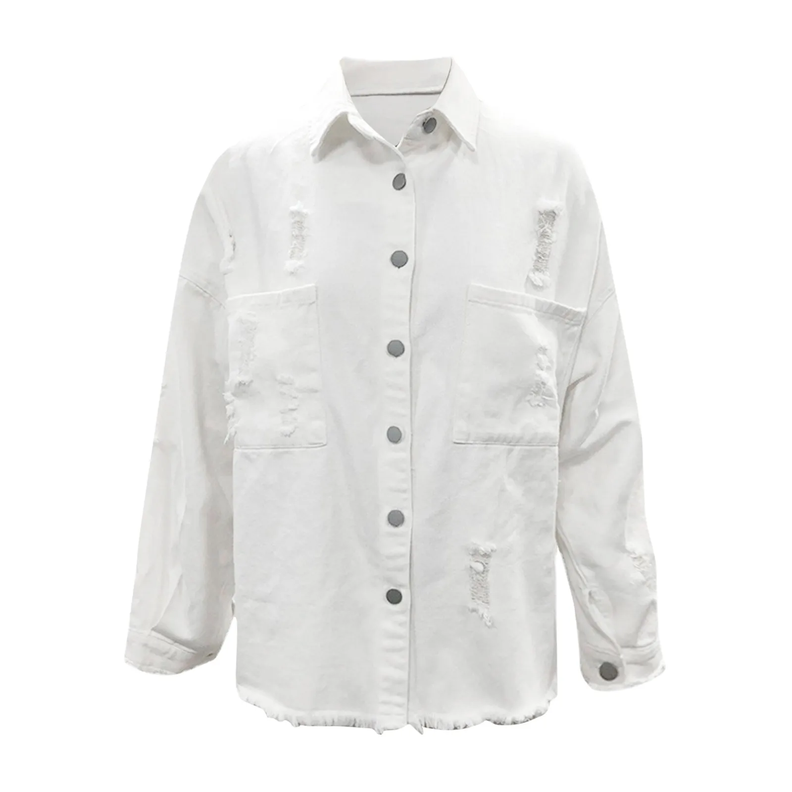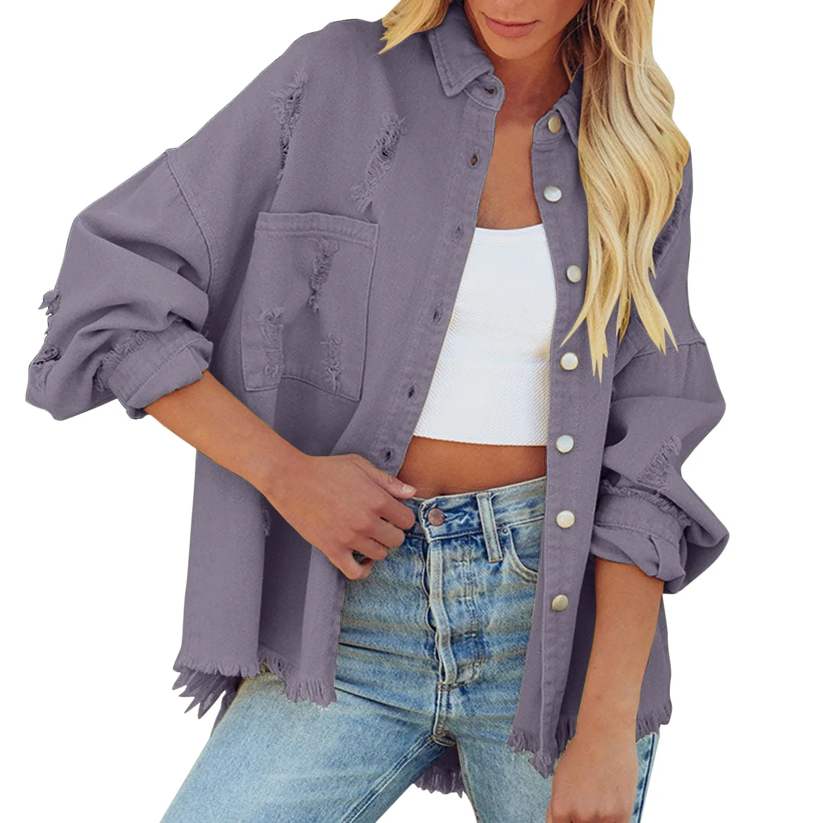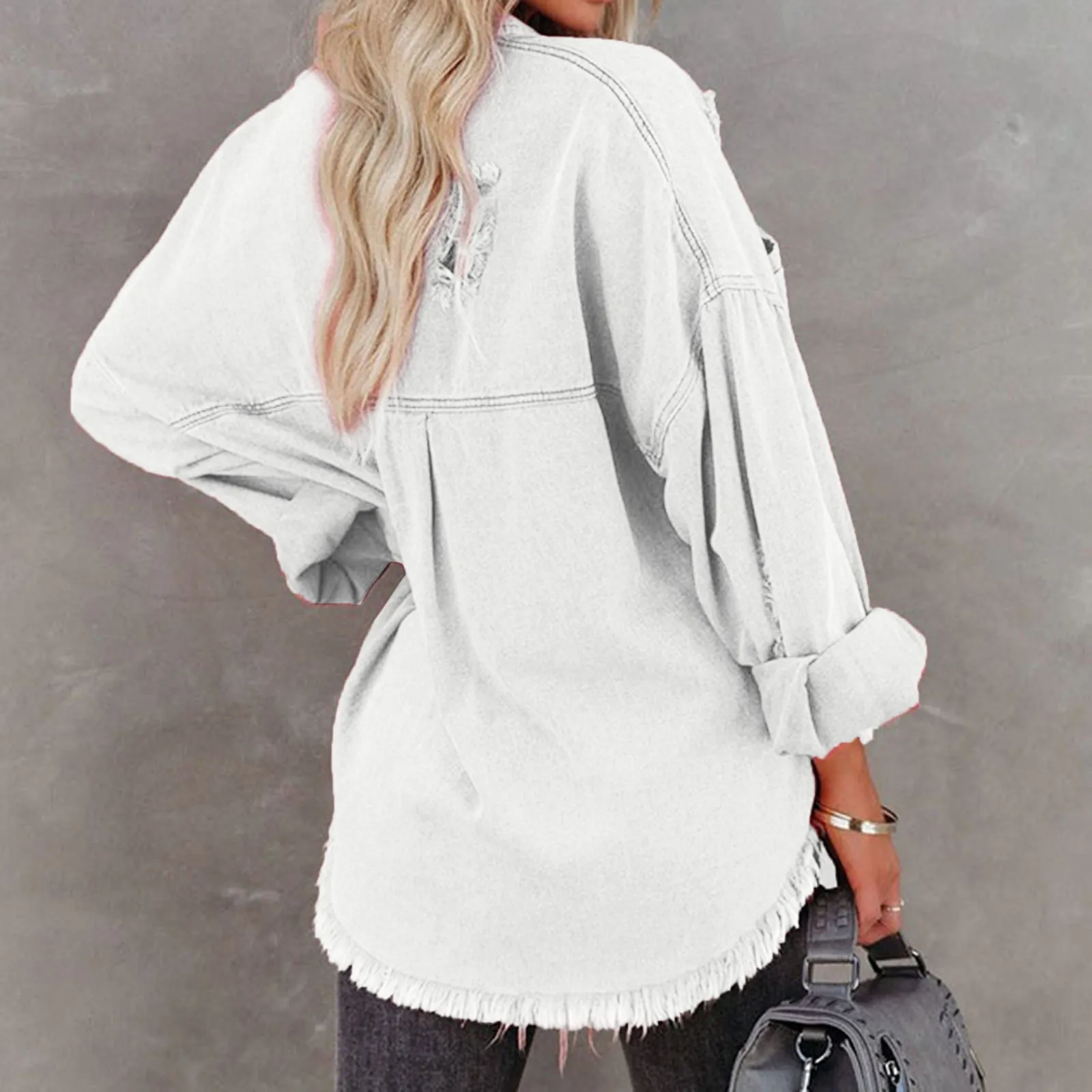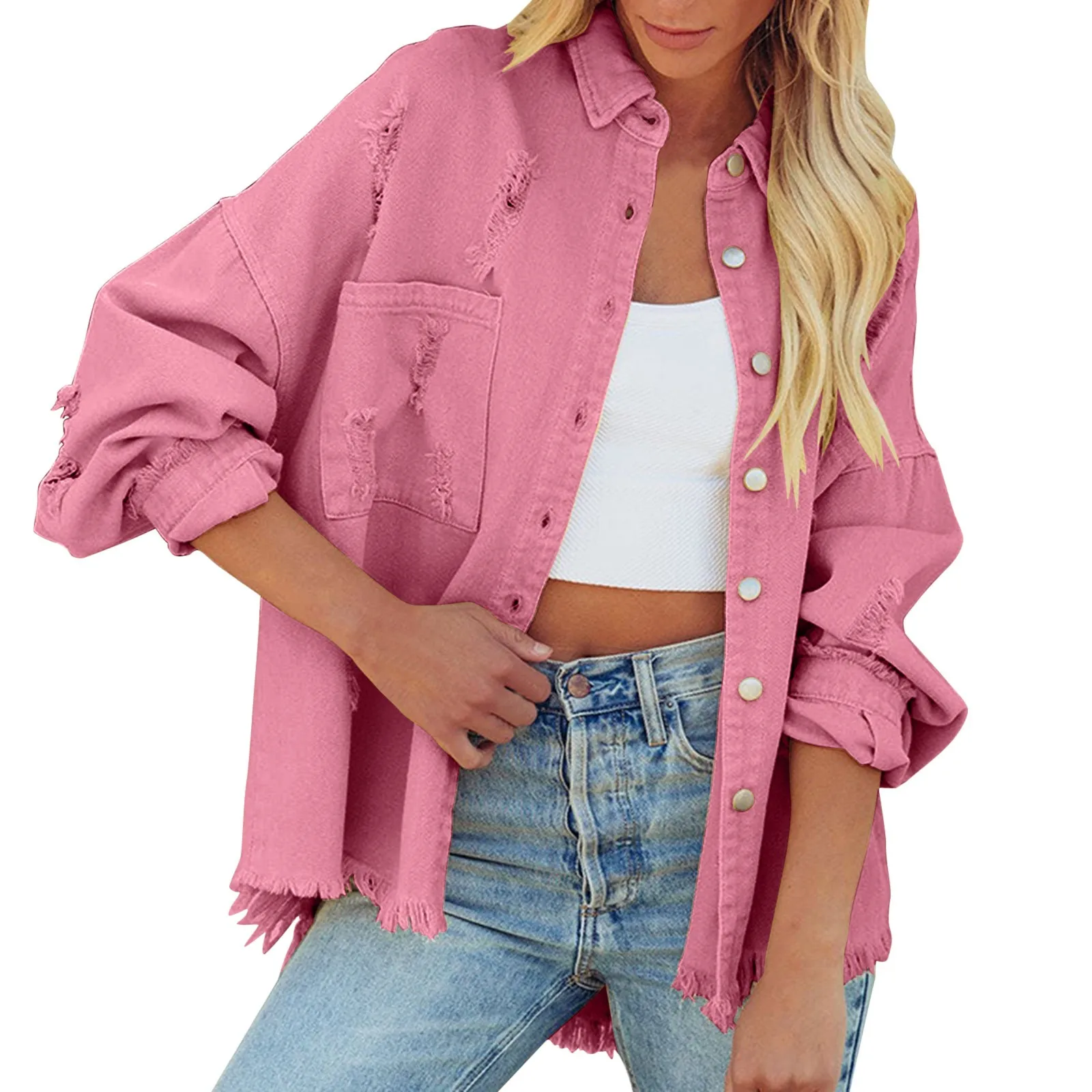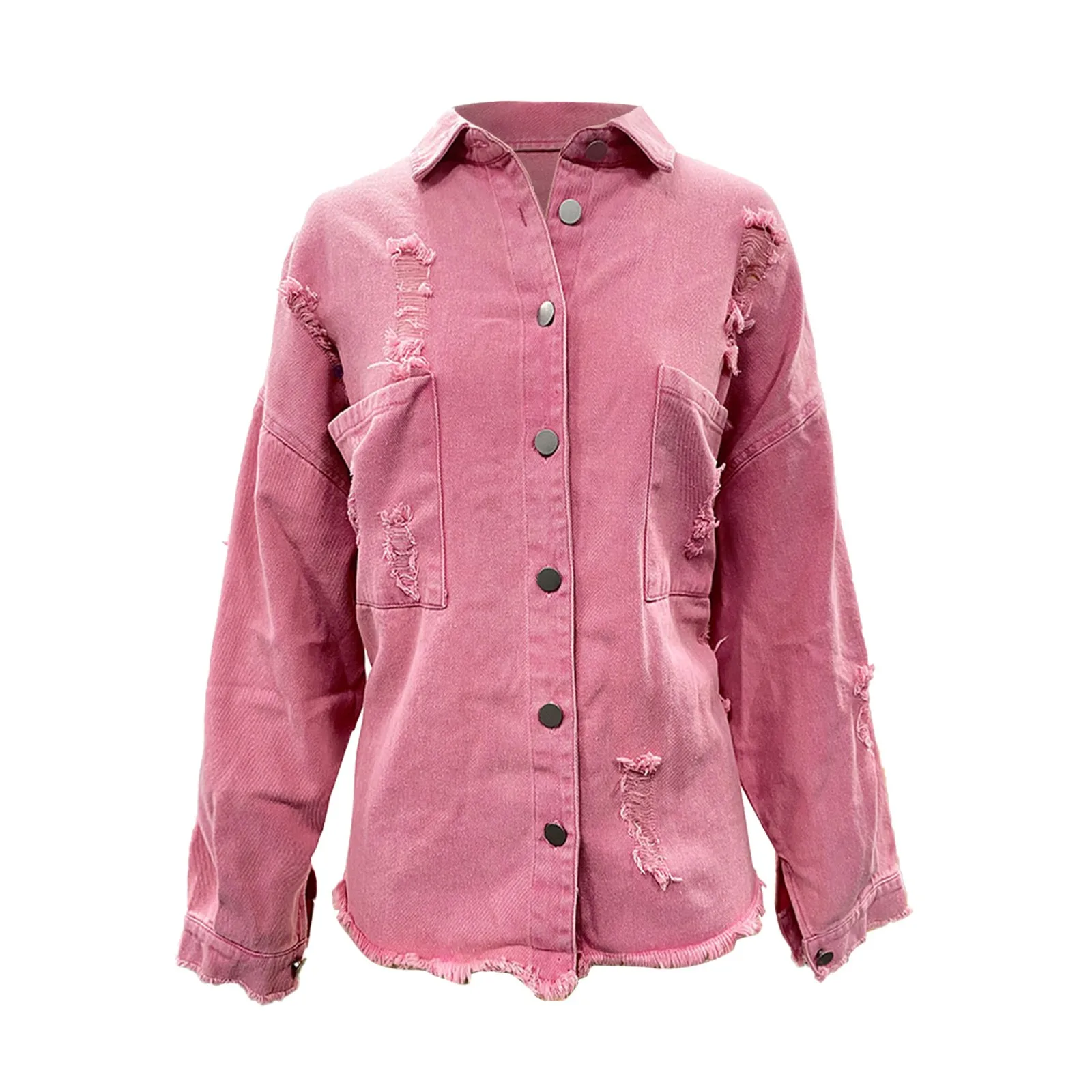 - Design & Style: This casual jean jacket features a lapel collar, long sleeves, two chest flap pockets, and a front button closure. The button cuffs and frayed hem add to its unique texture, making it a standout piece.