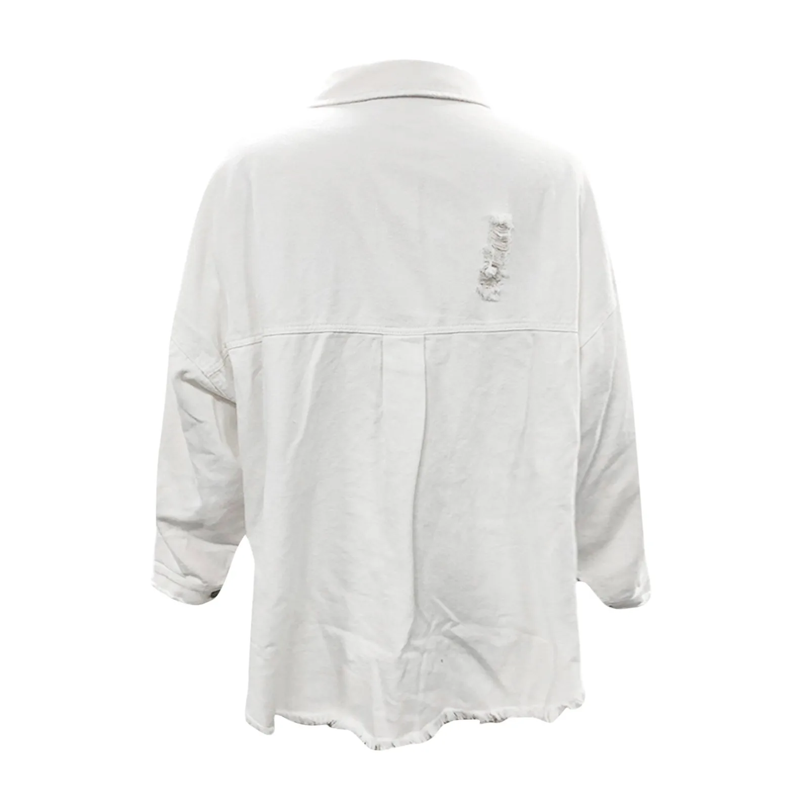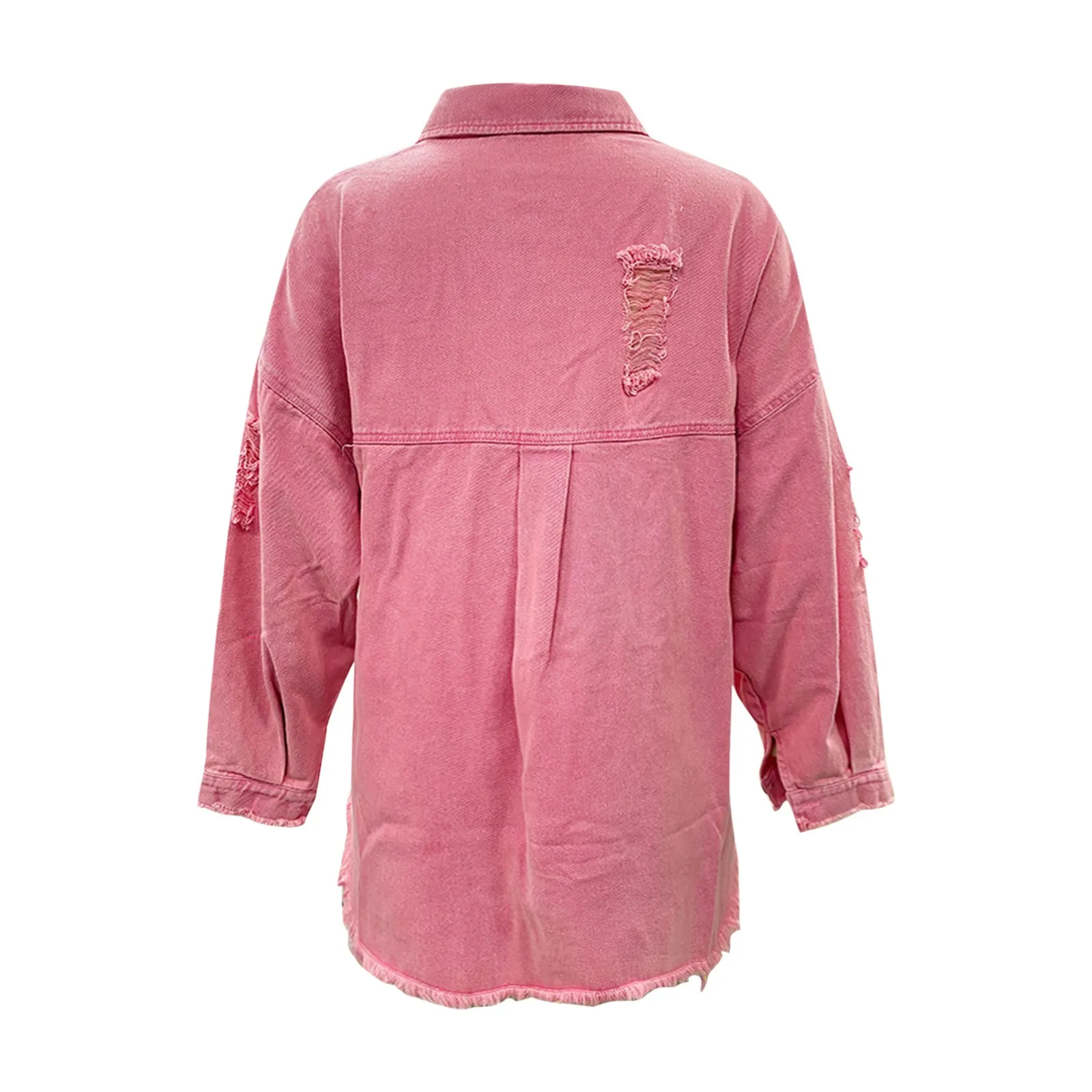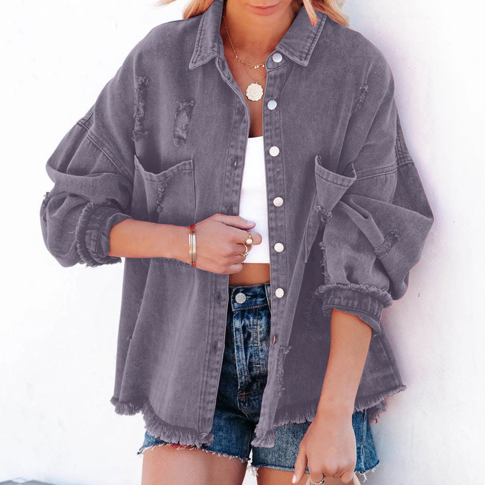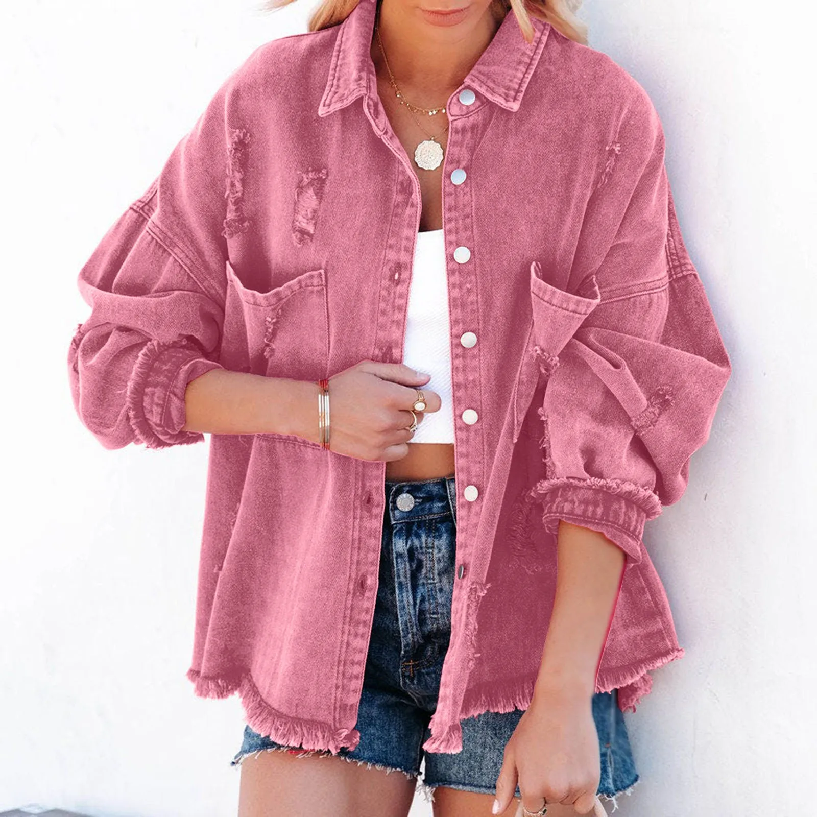 - Design & Style: This casual jean jacket features a lapel collar, long sleeves, two chest flap pockets, and a front button closure. The button cuffs and frayed hem add to its unique texture, making it a standout piece.