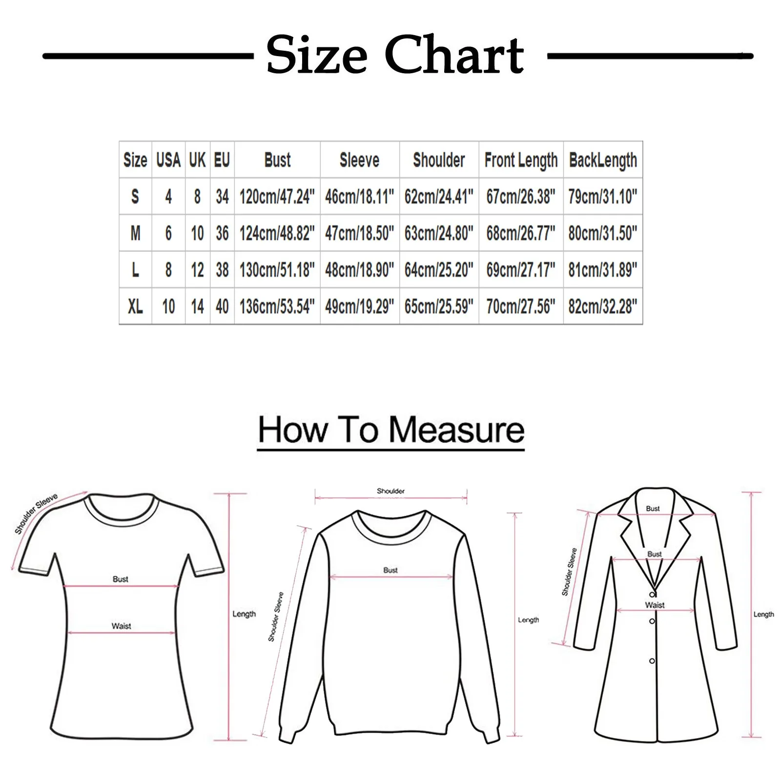 - Large (L): USA 8, UK 12, EU 38; Bust: 130 cm/51.18”, Sleeve: 48 cm/18.90”, Shoulder: 64 cm/25.20”, Front Length: 69 cm/27.17”, Back Length: 81 cm/31.89”.