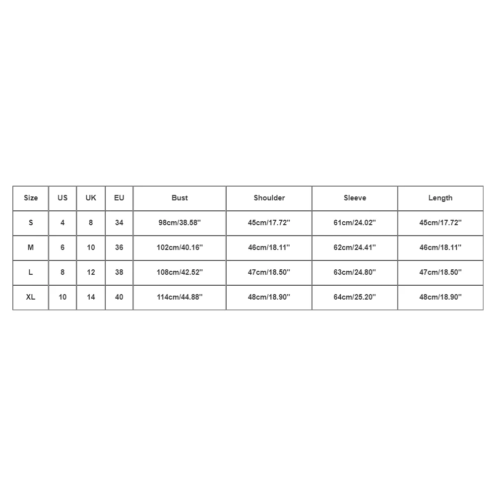 - Size XL: US 10, UK 14, EU 40; Bust: 114 cm/44.88”, Shoulder: 48 cm/18.90”, Sleeve: 64 cm/25.20”, Length: 48 cm/18.90”.