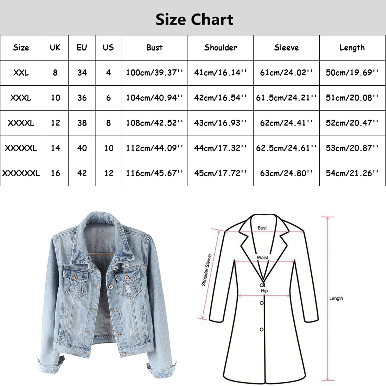 - XXXXL: UK: 12, EU: 38, US: 8, Bust: 108cm/42.52”, Shoulder: 43cm/16.93”, Sleeve: 62cm/24.41”, Length: 52cm/20.47”.