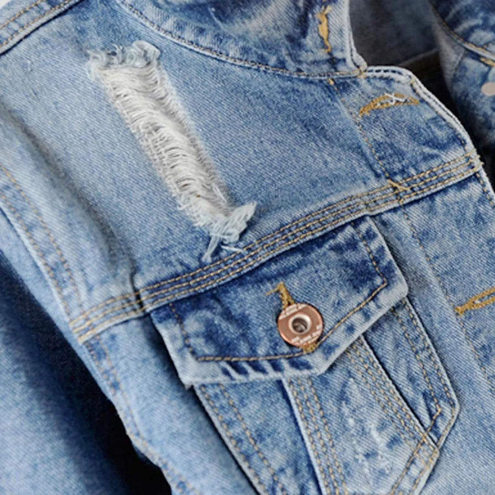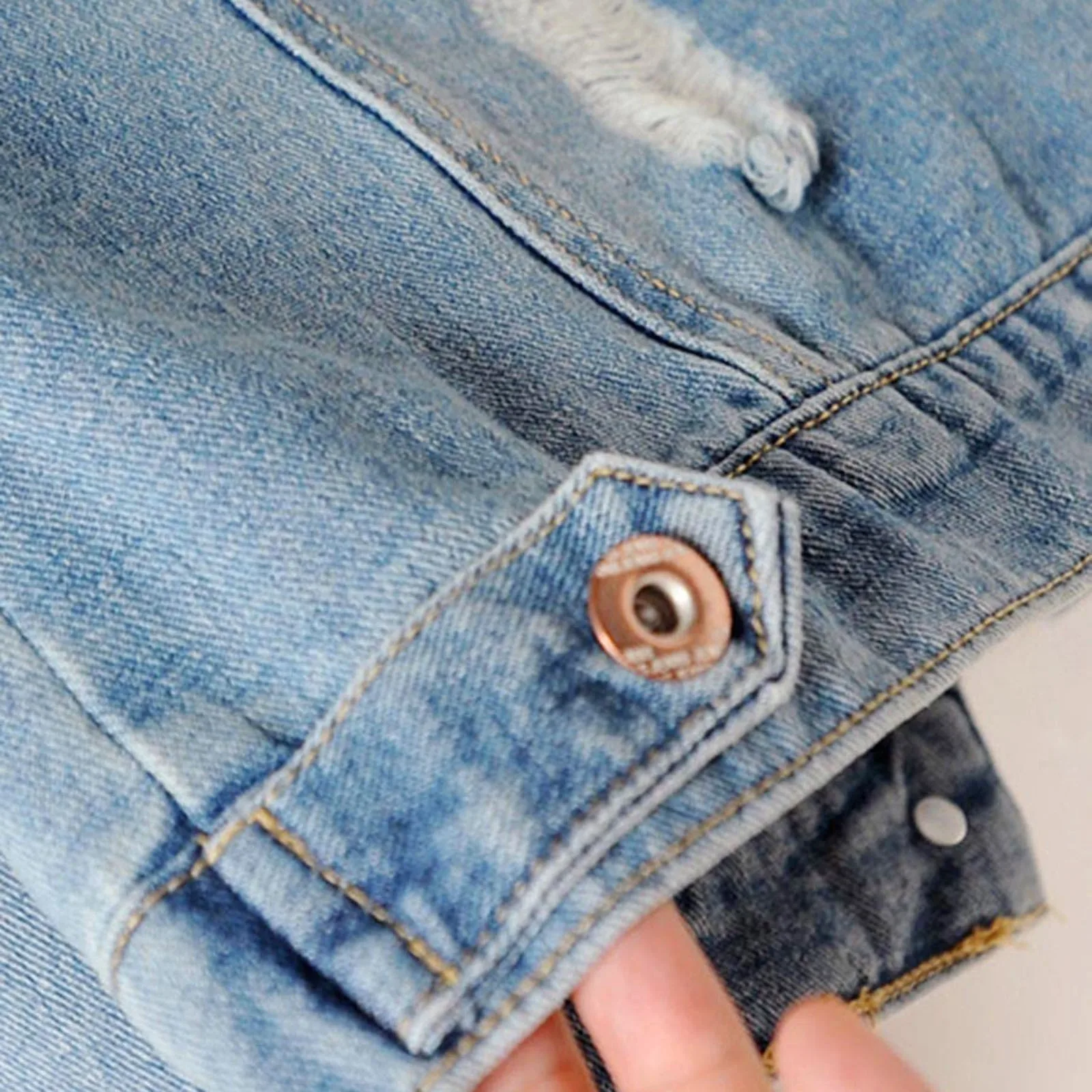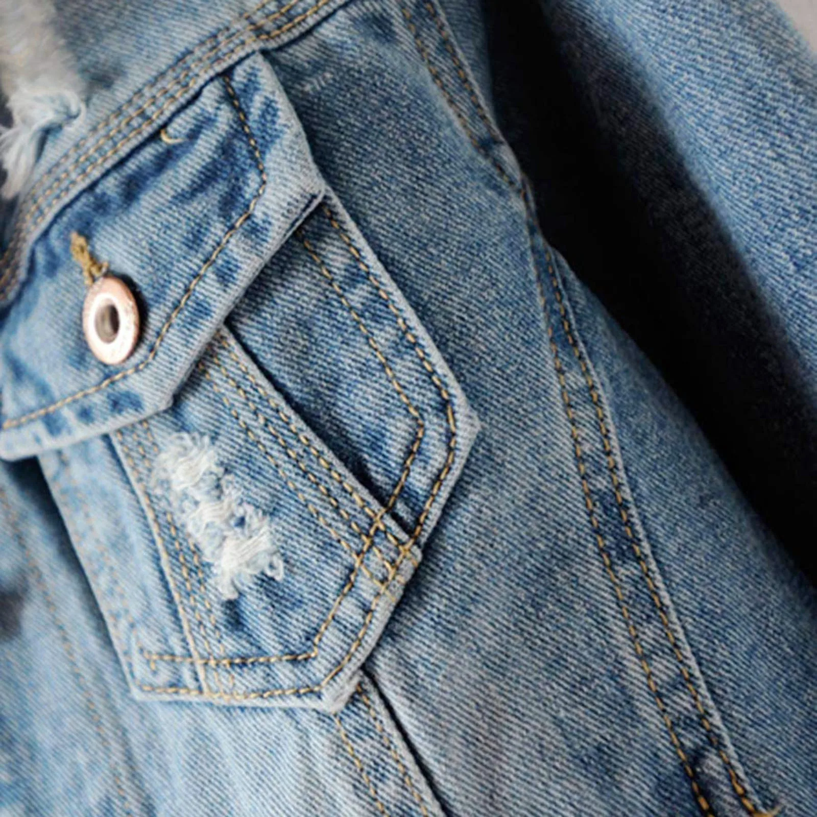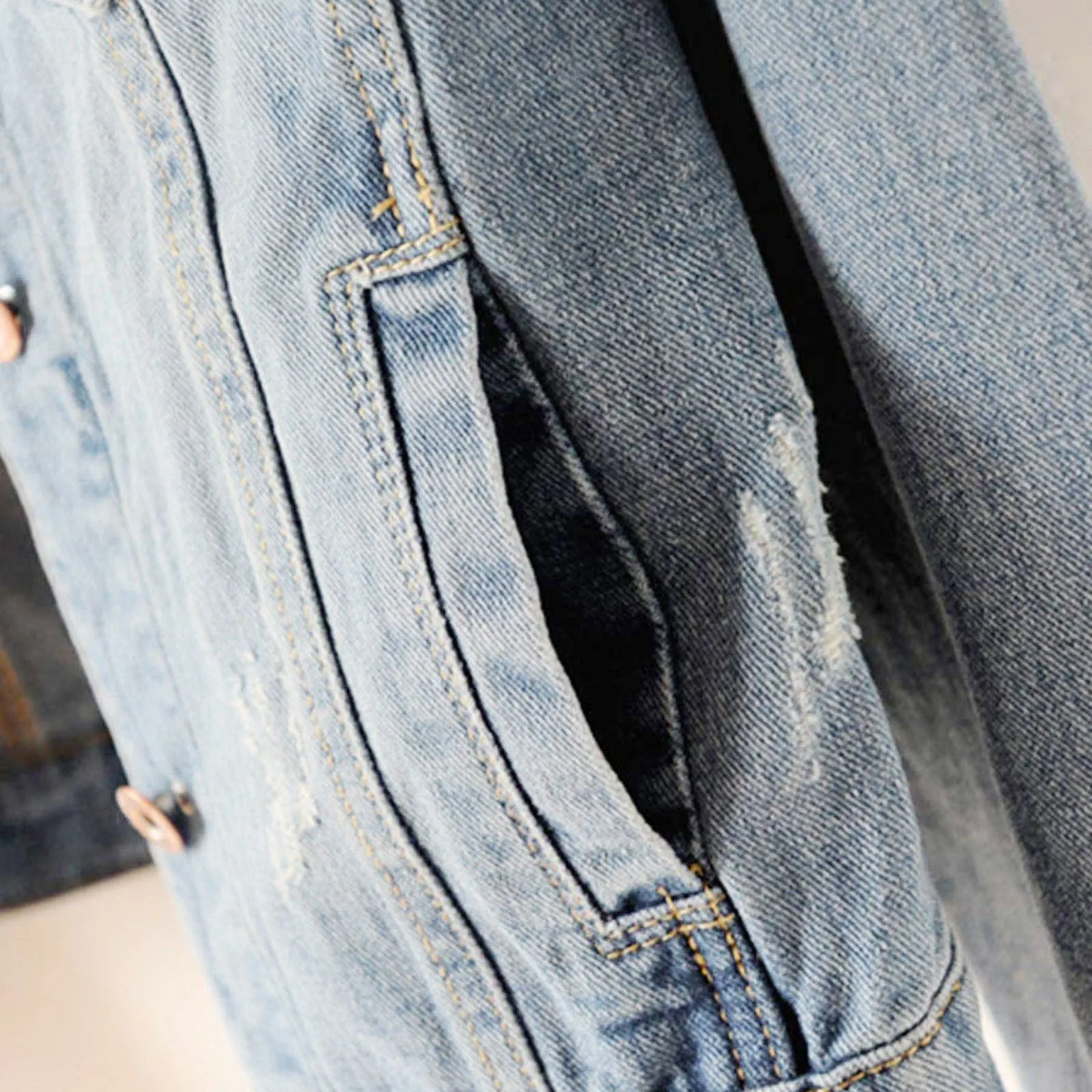 Design: The jacket features a regular fit, ideal for women. It’s a fashion staple with a vintage trucker style, complete with stylish ripped holes for a distressed, streetwear look.