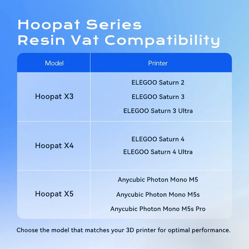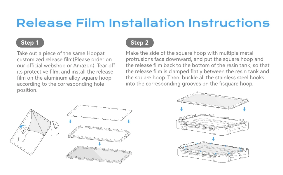 A: Yes! Hoopat’s vat works with any third-party release film, though you’ll need to punch the holes yourself. For convenience, we recommend our Hoopat Pre-cut Film. We’re committed to offering high-quality FEP, ACF, and PFA (nFEP) films at a fair price for the long run!