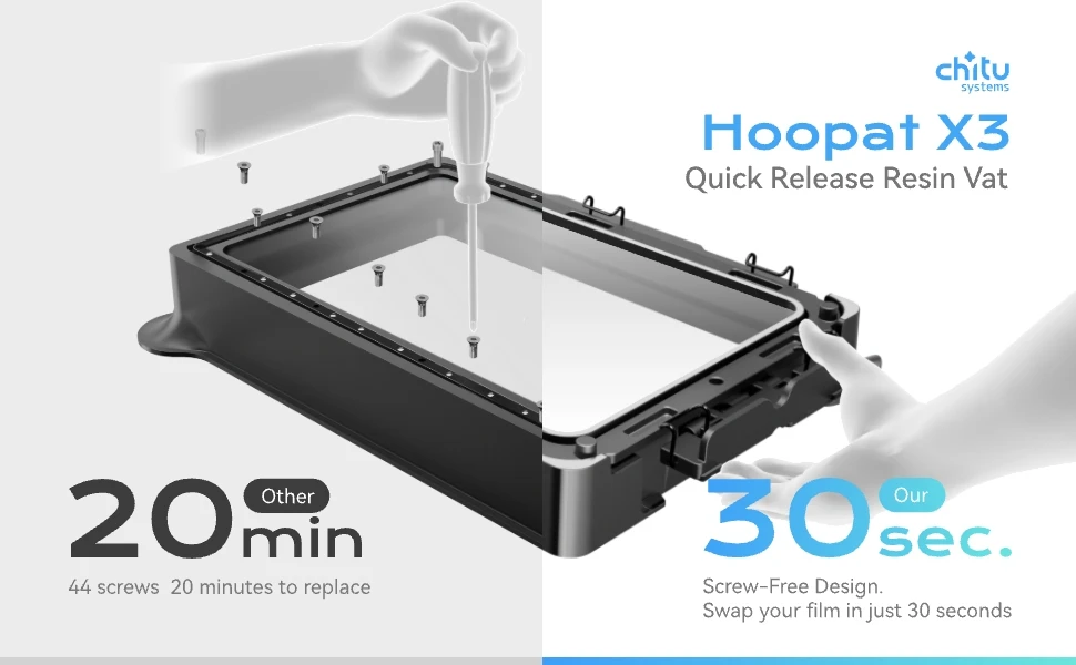 Say goodbye to messy screws! Our new snap-on vat eliminates all screws, allowing for a quick 30-second film replacement—compared to the traditional vat with 44 screws and 20 minutes of hassle.