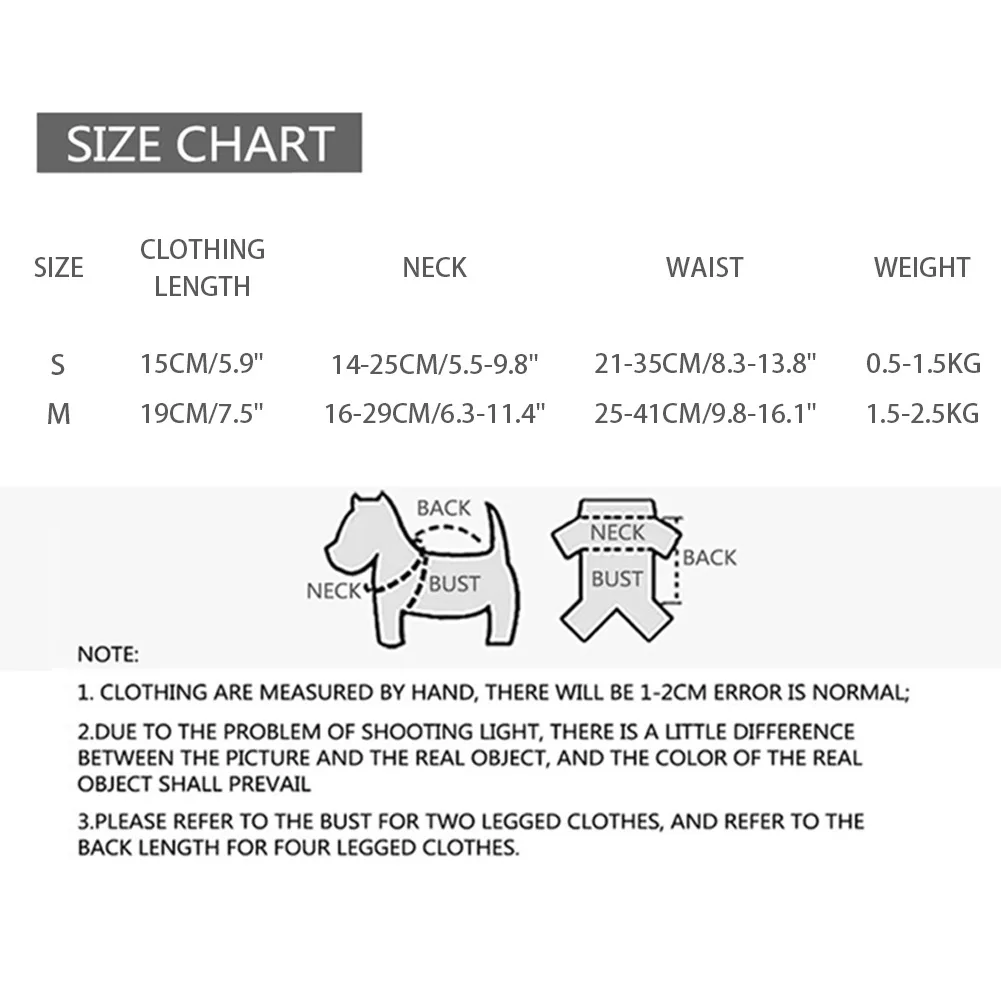 - Size S: length (without hat) 15CM/5.9″, neck circumference 14-25CM/5.5-9.8″, waist circumference 21-35CM/8.3-13.8″, recommended weight 0.5-1.5KG