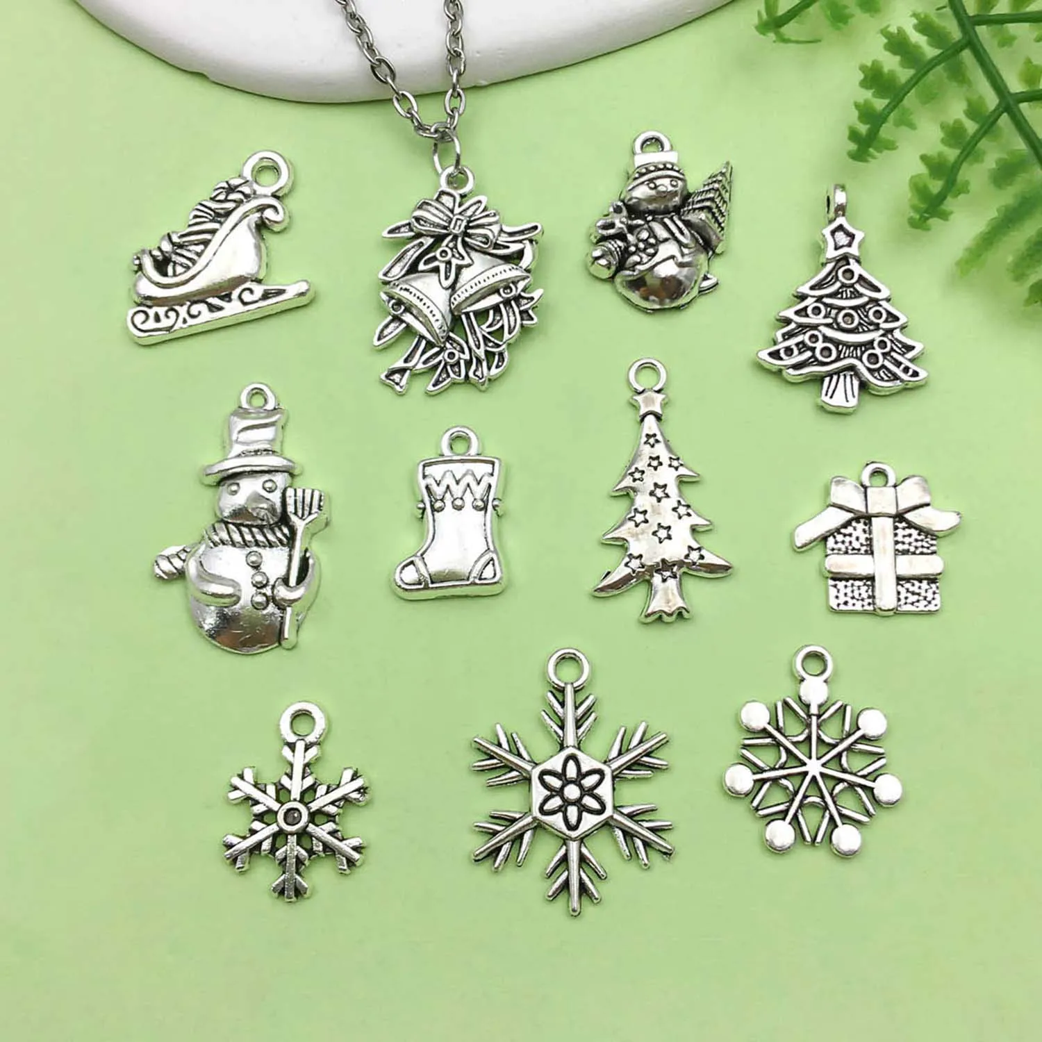 Bring festive cheer to your DIY projects with this set of Christmas-themed alloy charms. With classic holiday designs like Santa Claus, snowflakes, stockings, snowmen, reindeer, bells, gifts, and Christmas trees, these lightweight pendants are perfect for handmade jewelry, ornaments, gift tags, and seasonal crafts.