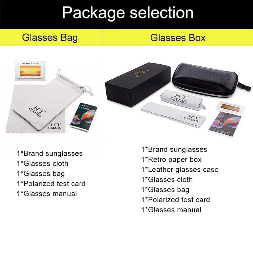 - Glasses Box Package: Includes Sunglasses, Retro Paper Box, Leather Glasses Box, Glasses Bag, Glasses Cloth, Polarized Light Test Card, Glasses Manual