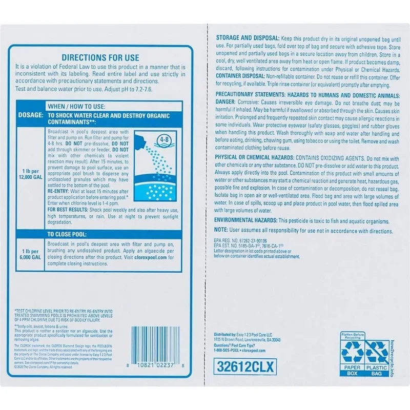 - Usage: Use 1 lb. per 12,000 gallons of water. Shock the pool weekly and after heavy use, high temperatures, or rain.