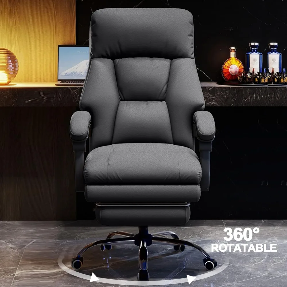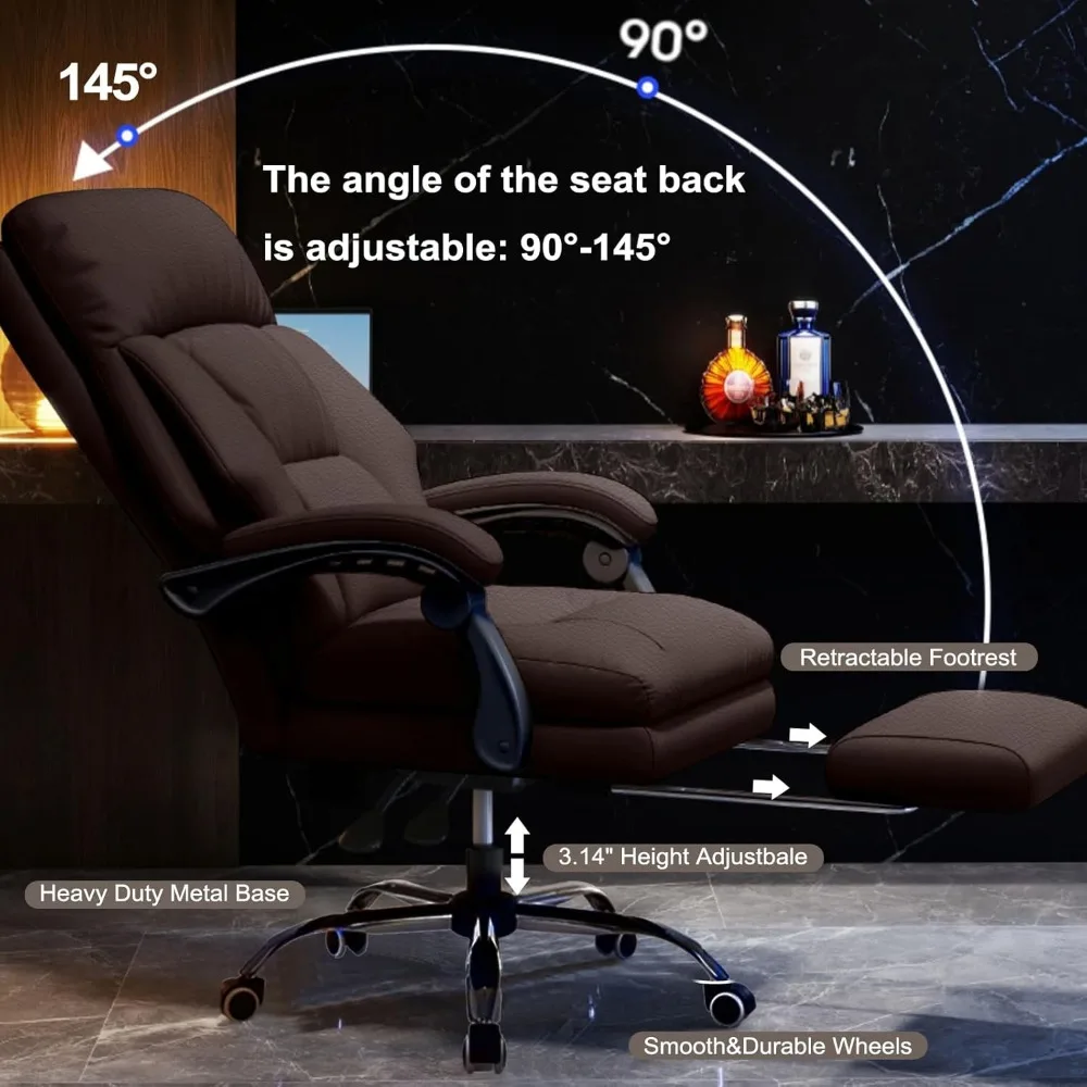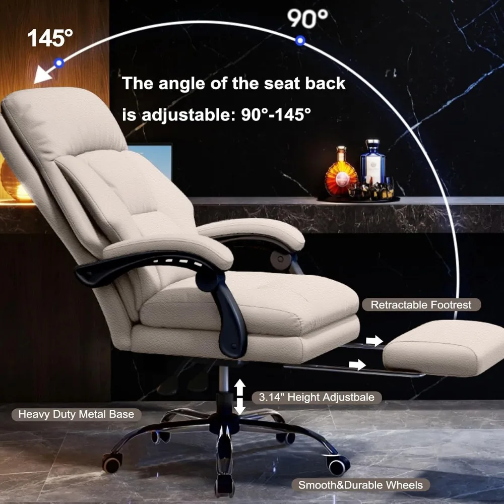 - FUNCTIONAL: You can lean back and relax by easily tilting back or locking it in place with the tilt-locking mechanism. This wide office desk chair features adjustable angles (from 90° to 130°) and a 3.93″ height adjustment. You can recline in different positions or adjust the seat to your desired height. The retractable footrest is a great bonus for relaxing your legs.