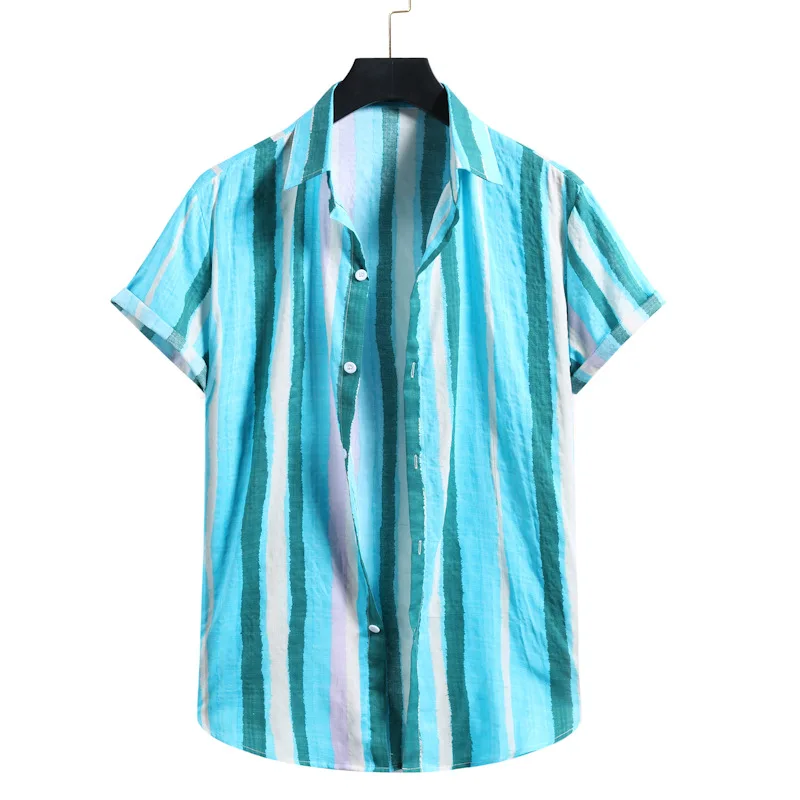 Available in a refreshing turquoise color, this shirt comes in a variety of sizes ranging from S to XXL, ensuring a perfect fit for every body type. Its single-breasted closure adds a classic touch, while the regular sleeve style and striped pattern offer a modern twist on the traditional Hawaiian shirt. Designed with summer and beach scenes in mind, it’s not just a piece of clothing but a statement of leisure and relaxation.