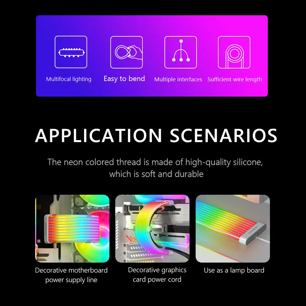 • Multi-Faceted Lighting: This RGB light strip PSU cable features front, back, and side illumination, creating a 360-degree surround effect. The flowing stripe illumination design adds a futuristic touch.
