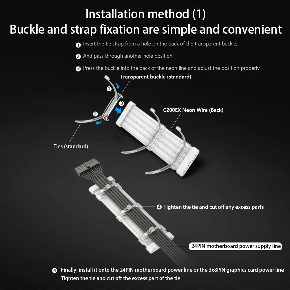 - Install the cable to the 24-pin motherboard power cable or 3×8-pin graphics card power cable, tighten the tie, and cut off the excess tie.