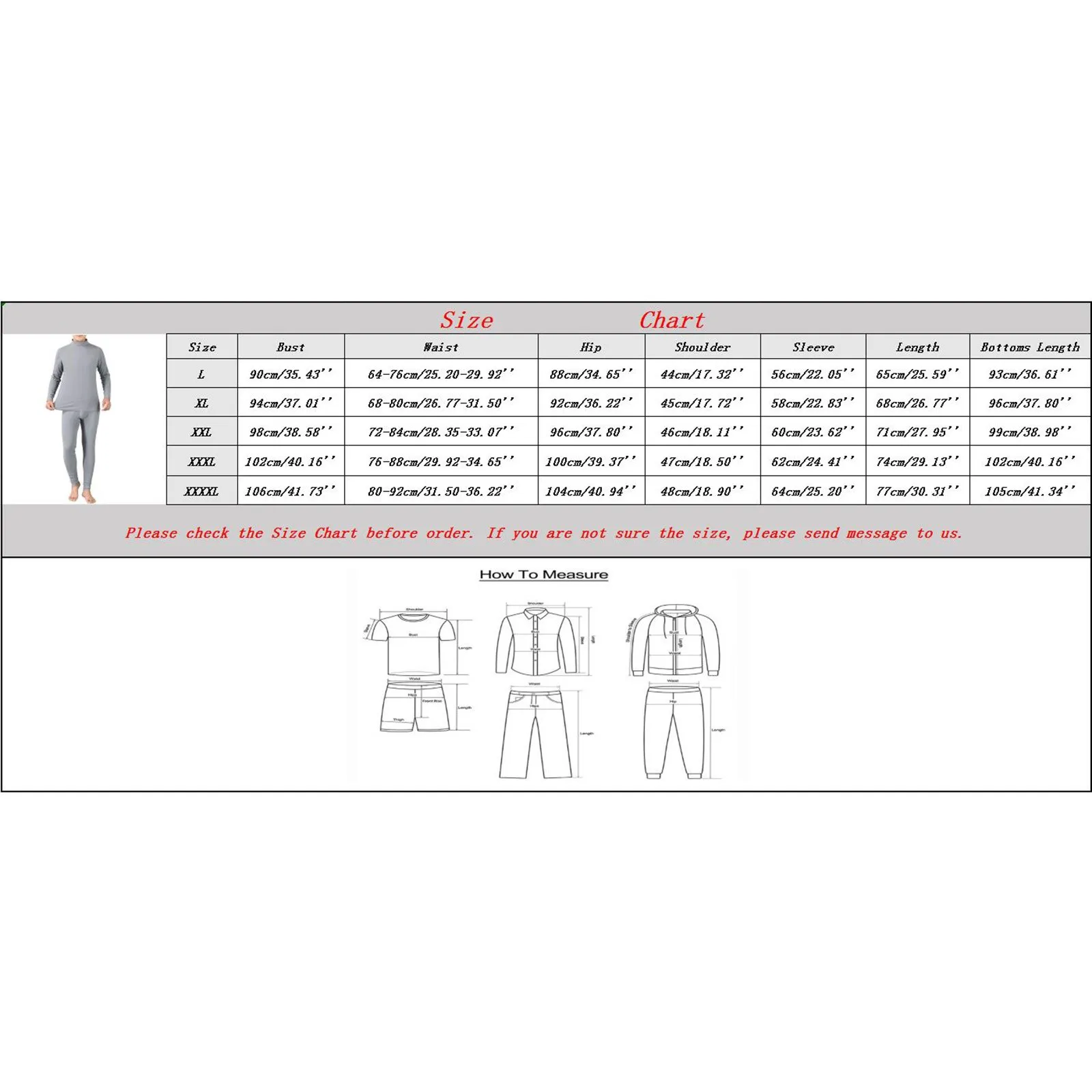 - XXXXL – Bust: 106cm/41.73”, Waist: 80-92cm/31.50-36.22”, Hip: 104cm/40.94”, Shoulder: 48cm/18.90”, Sleeve: 64cm/25.20”, Length: 77cm/30.31”, Bottoms Length: 105cm/41.34”