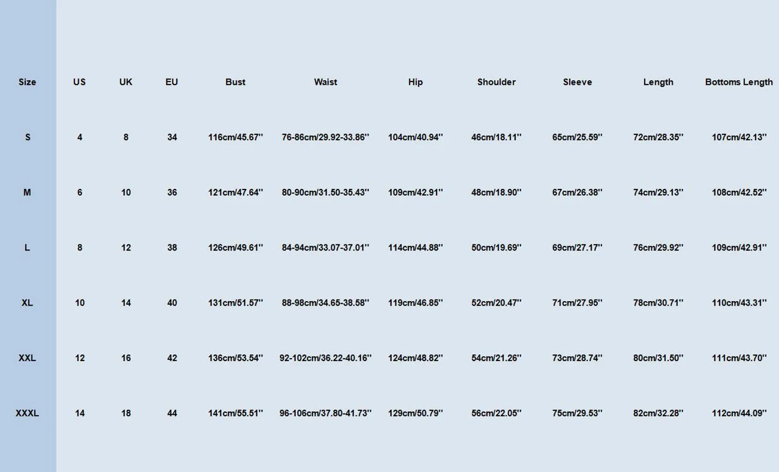 - Bottoms Length: 112 cm/44.09”