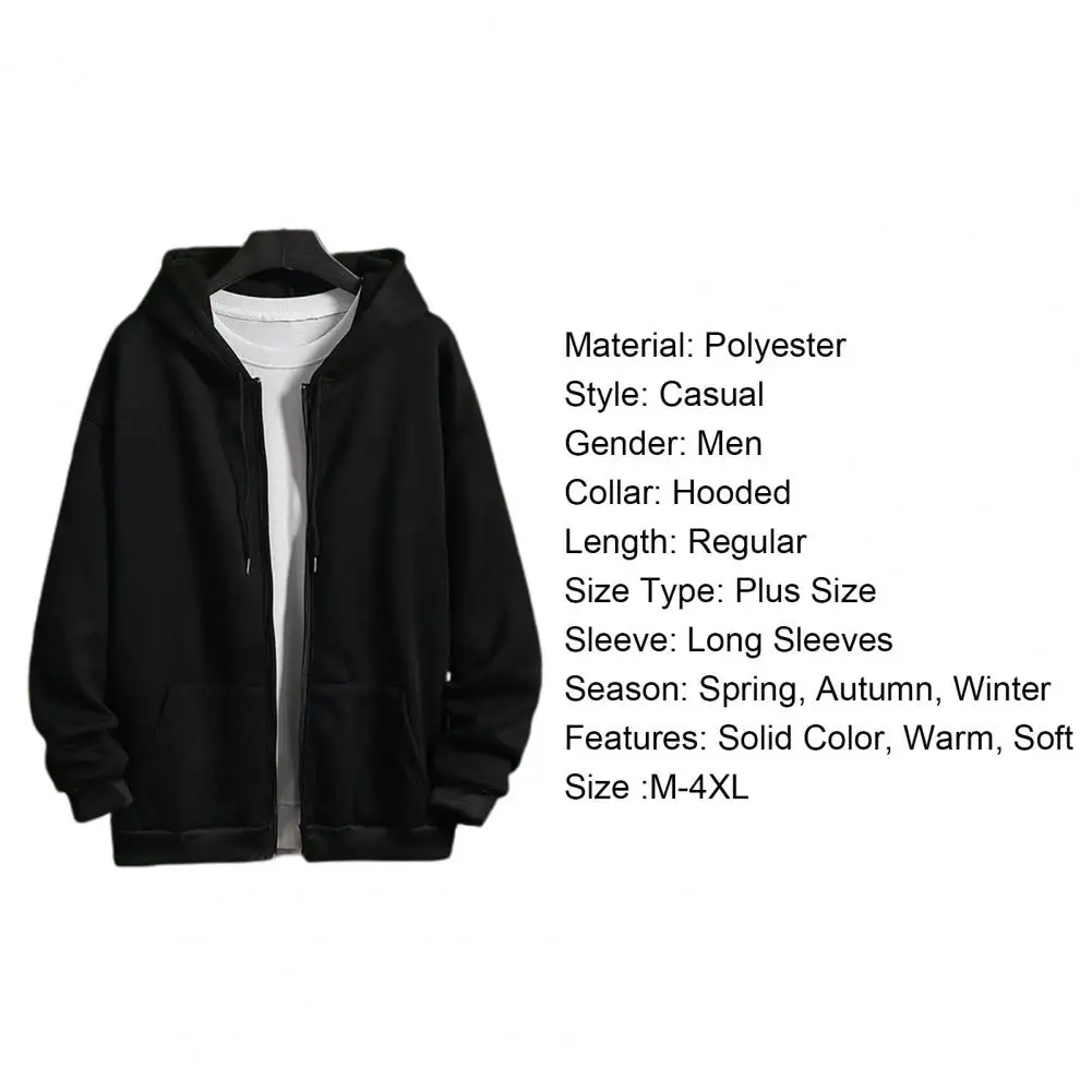 Item Name: Coat Material: Polyester Style: Casual Gender: Men Collar: Hooded Length: Regular Size Type: Plus Size Sleeve: Long Sleeves Season: Spring, Autumn, Winter Features: Solid Color, Warm, Soft