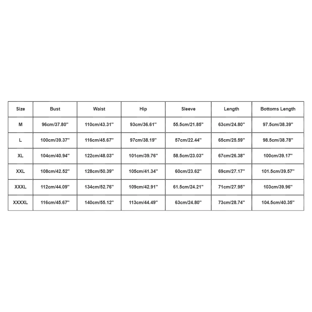 - XXXXL: Bust: 116cm/45.67”, Waist: 140cm/55.12”, Hip: 113cm/44.49”, Sleeve: 63cm/24.80”, Length: 73cm/28.74”, Bottoms Length: 104.5cm/40.35”
