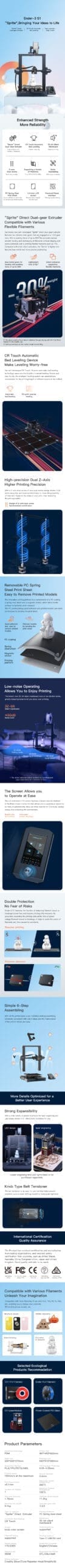 Power Loss Recovery and Filament Sensor: The Ender-3 S1 is equipped with a system to detect filament runout or breakage, as well as power loss. It can resume printing after recovery, accurately recording printing data to prevent filament and time wastage due to accidents.