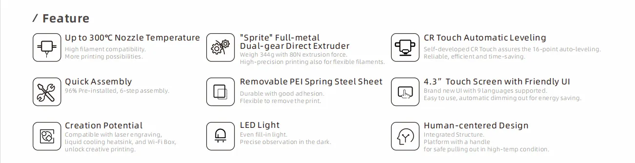 “Sprite” Direct Dual-gear Extruder: The “Sprite” extruder is lightweight, offering precise positioning with reduced inertia. It supports a variety of print filaments including PLA, TPU, PETG, and ABS.