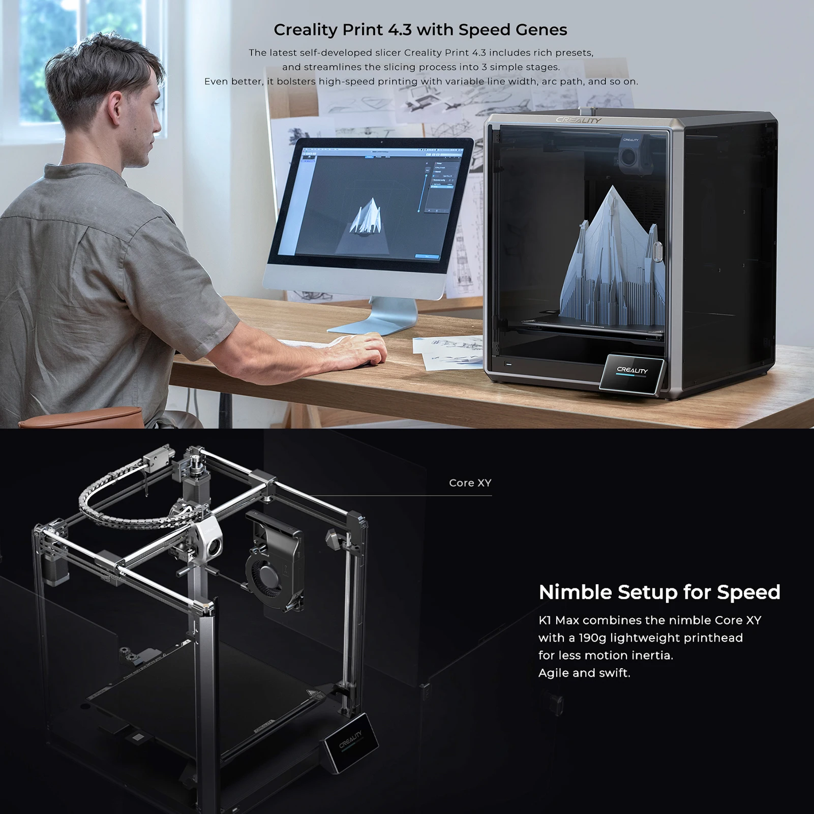 - Crazy 600mm/s Printing Speed: Combining a nimble Core XY system with a 190g lightweight printhead, the K1 Max ramps up to 600mm/s in only 0.03s with 20000mm/s² acceleration. It is 12 times faster than a regular 3D printer. The speed is bolstered by a powerful dual-core CPU and the latest self-developed slicer, Creality Print. It can be as productive as several 3D printers together.