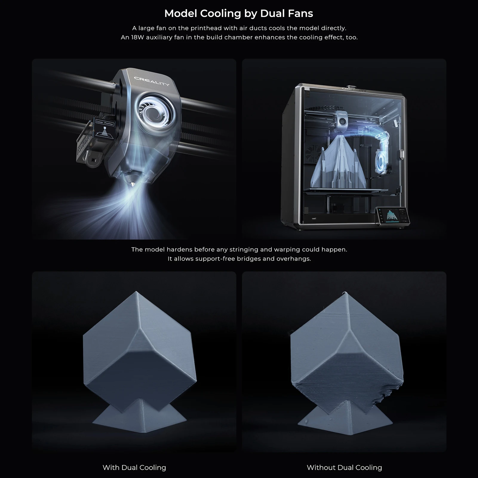 - 32mm³/s Flow & Dual Cooling: A new ceramic heater encircling the hotend can melt various filaments instantly. The dual-gear direct drive extruder and titanium alloy heatbreak ensure a 32mm³/s full-blast feeding flow at up to 300℃. The freshly printed model is cooled rapidly by two fans: one on the printhead with directional air ducts, and another in the build chamber. The model hardens before any stringing and warping can occur.