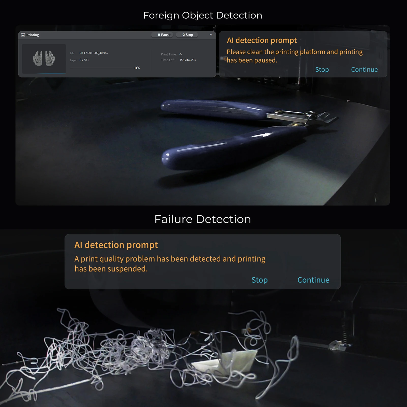 - AI-assisted Carefree Printing: The 1μm resolution LiDAR will scan the first layer automatically. It will pause printing and notify you immediately if something goes wrong. The K1 Max also uses an AI camera to watch for spaghetti failure, foreign objects, debris, etc. It will alert you when an error occurs. It also supports real-time monitoring and creates time-lapses for sharing.