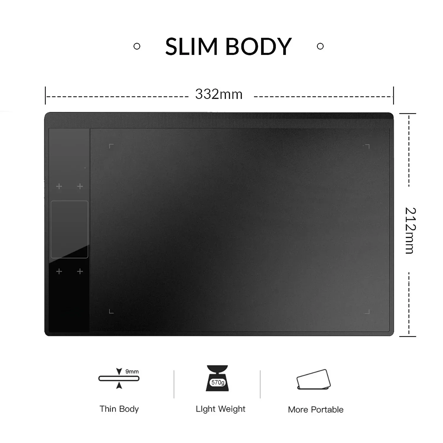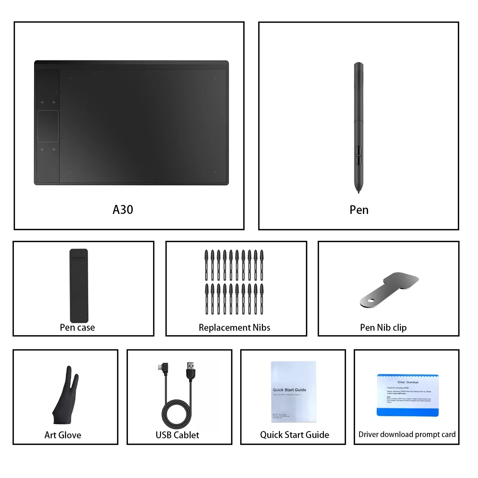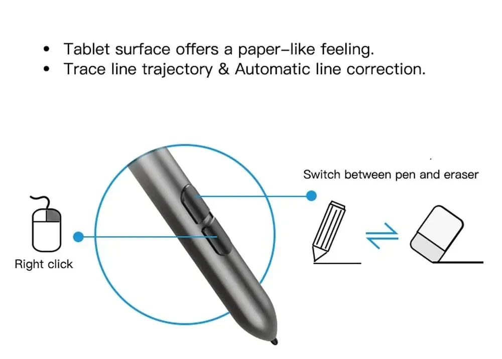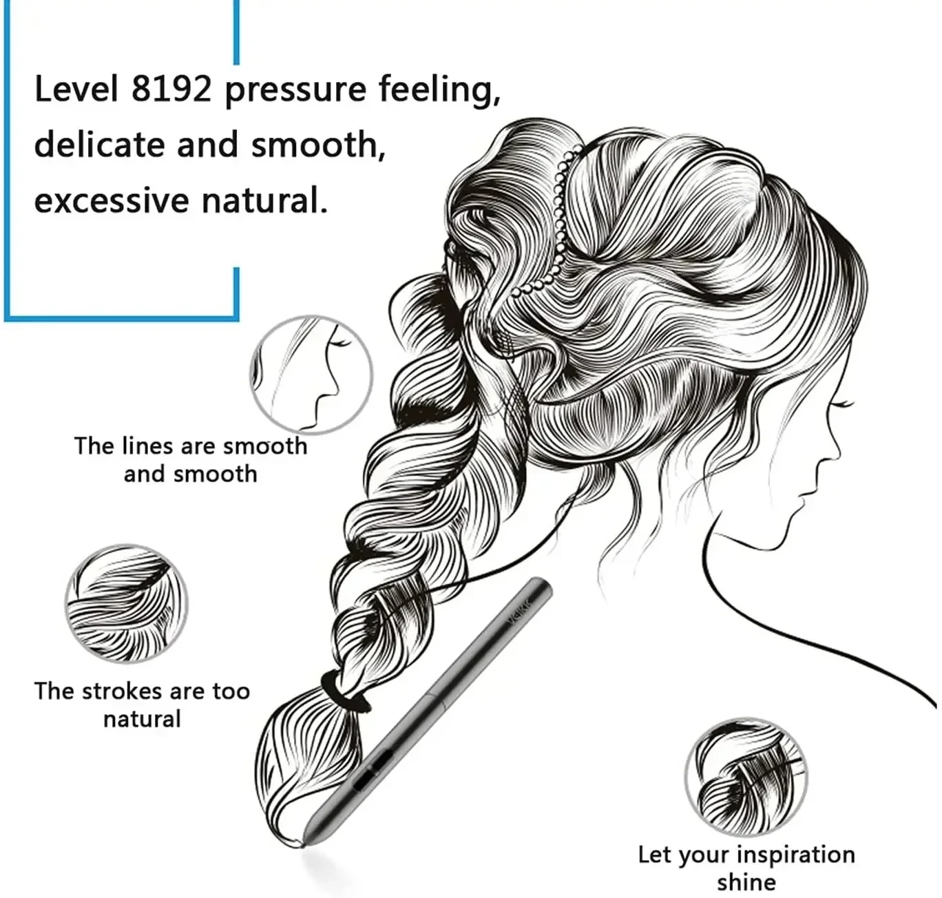 Battery-Free Pen The digital pen features 8192 levels of pressure sensitivity, ensuring accuracy and a natural writing experience akin to real paper. It includes two programmable shortcuts for efficient workflow and clean hands during creative sessions. The pen requires no battery changes or charging, making it ideal for long-term projects. The package comes with 8 replaceable nibs.