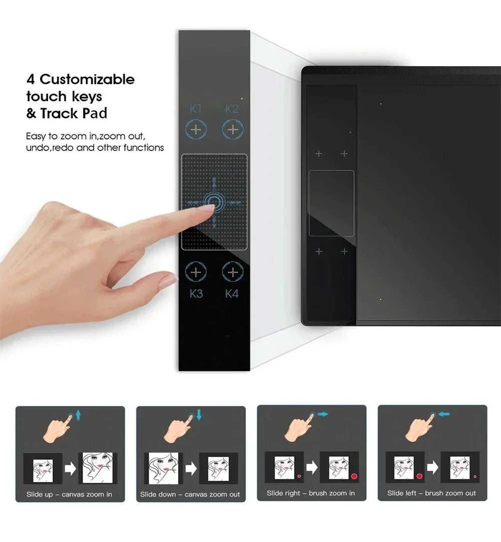 4 Touch Keys and 1 Touch Panel The tablet offers full touch control with 4 customizable touch shortcuts, tailored to your preferred software or painting habits. The touch panel functions like a trackpad, allowing canvas and brush control, enhancing work efficiency and creative freedom.